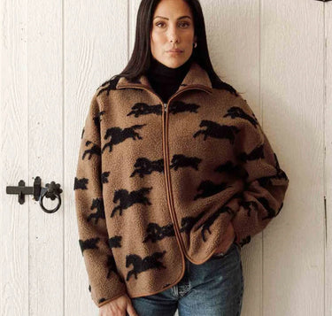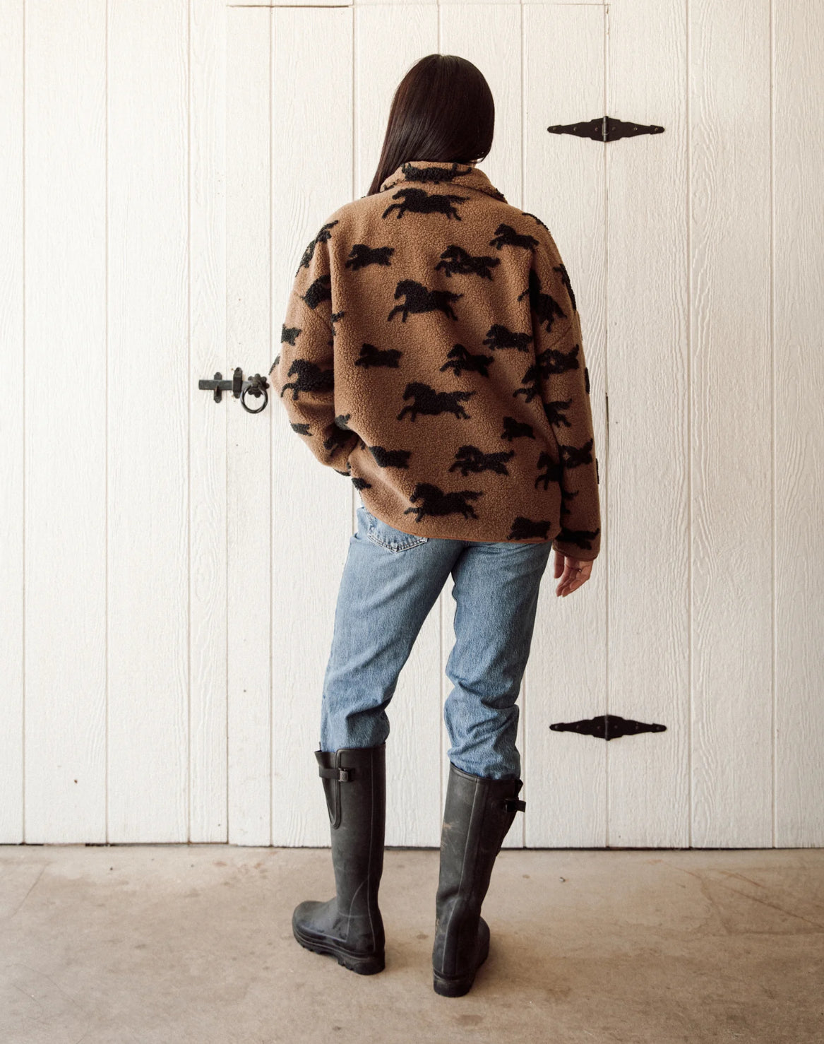 The Brunette the Label Wild Horse Sherpa Jacket is your ultimate cozy statement piece. This oversized, relaxed-fit sherpa fleece is crafted from warm 100% Polyester with a comfortable jersey lining, designed in an equestrian-inspired shape.Featuring cotton binding along the zipper, cuffs, and hem, this full zip jacket is polished, easy to wear, and perfect to layer or wear solo. It's the ideal outerwear piece that provides maximum warmth and effortless style.