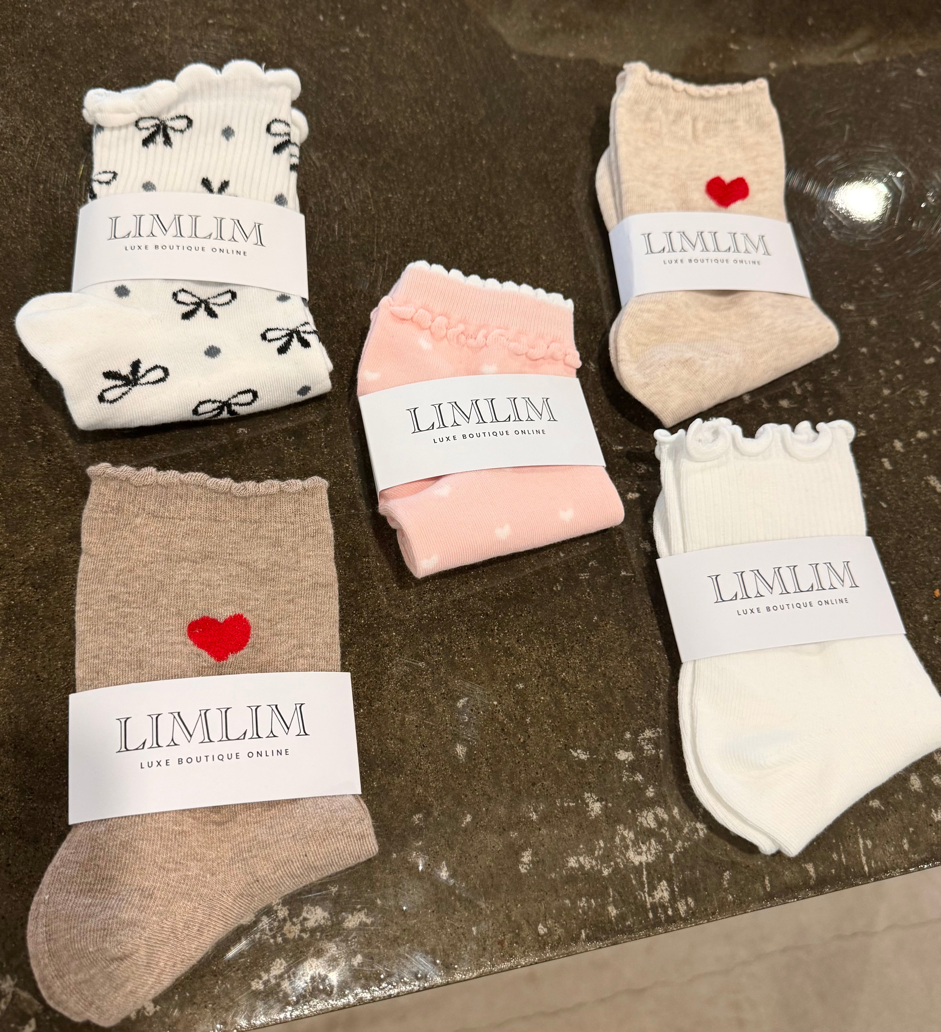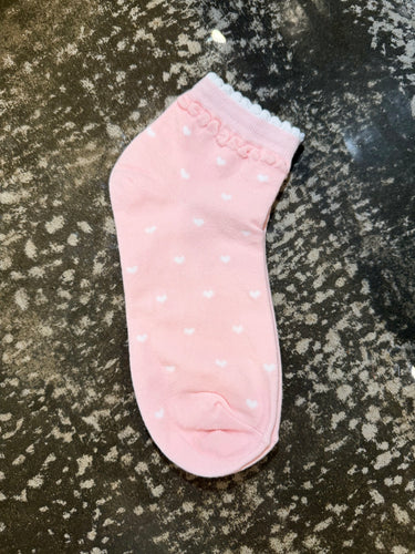 LIMLIM Ankle Light Heart Socks in Pink with White hearts and ruffle detailing. Soft, comfy and cute. Fits size 4-10. One pair per set.
