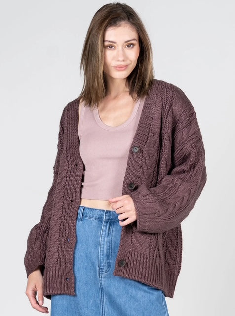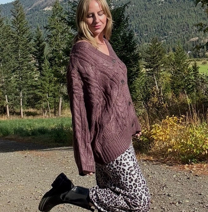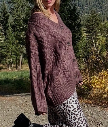 The C'est Moi Women's Chunky Cable Knit Cardigan is the quintessential layering piece for effortless style and warmth. This oversized V-neck cable knit sweater is crafted from 100% Acrylic, providing luxurious volume and exceptional softness with minimal maintenance. Designed with a slouchy, relaxed fit, this classic button-up cable cardigan effortlessly functions as sophisticated outerwear. The beautiful cable knit texture ensures this C'est Moi staple is timeless, versatile, and irresistibly soft to the touch.