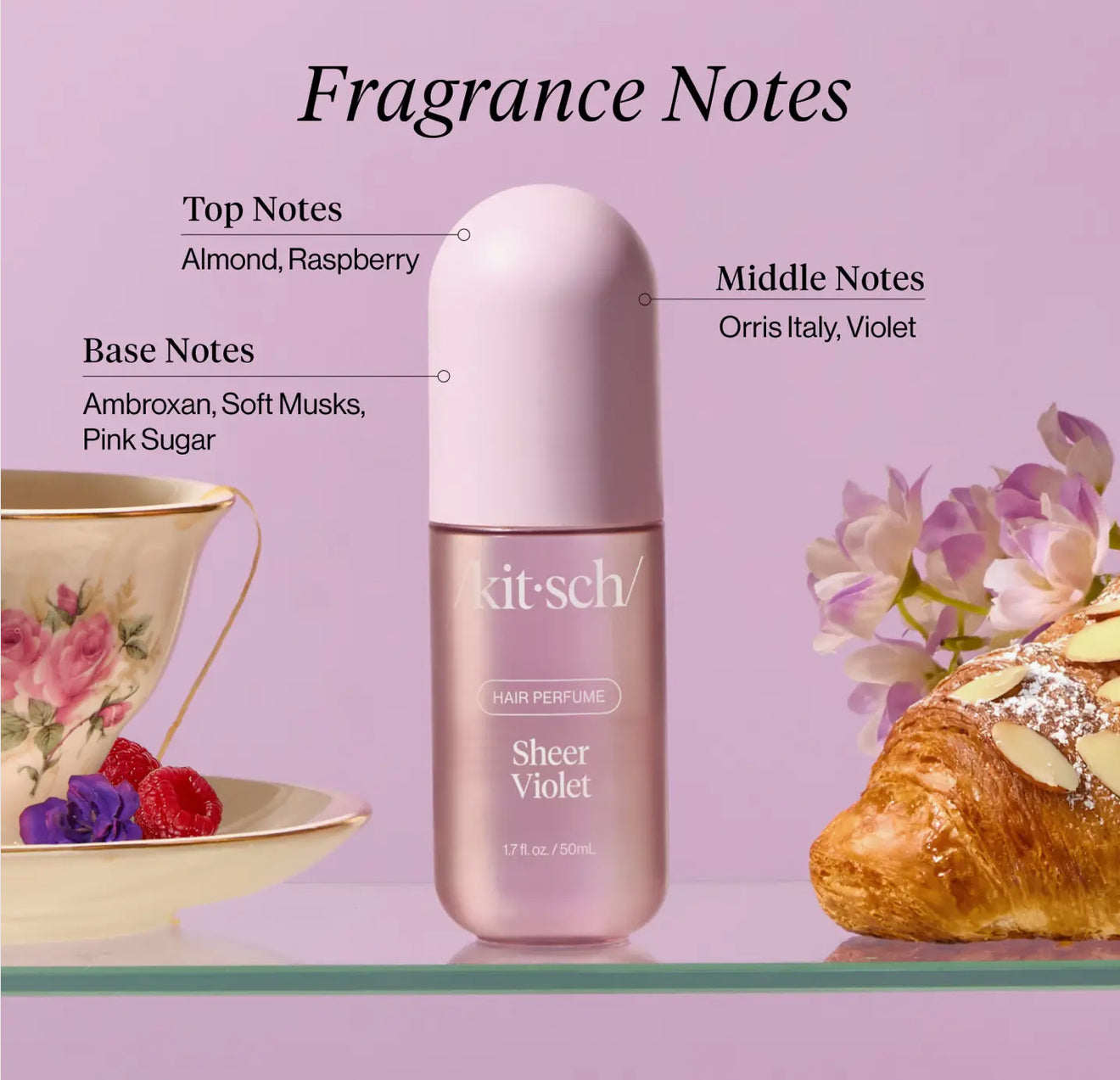 The Kitsch Sheer Violet Hair Perfume is a quick, sheer, and versatile way to refresh your hair and body between washes with a delightful floral fruity musk fragrance. This luxurious scent, crafted by a world-renowned fragrance house, captures the charm of a sweet tea enjoyed in a French bakery with the perfect mix of raspberry, violet, and soft musk notes for a delicate yet decadent aroma. Formulated with patented odor-eliminating molecules, the perfume is scientifically proven to neutralize odors at the source. This vegan, cruelty-free, travel-friendly product is free from synthetic CMRs, phthalates, parabens, and PFAS, and the bottle is made with 30% PCR (Post-consumer recycled content).