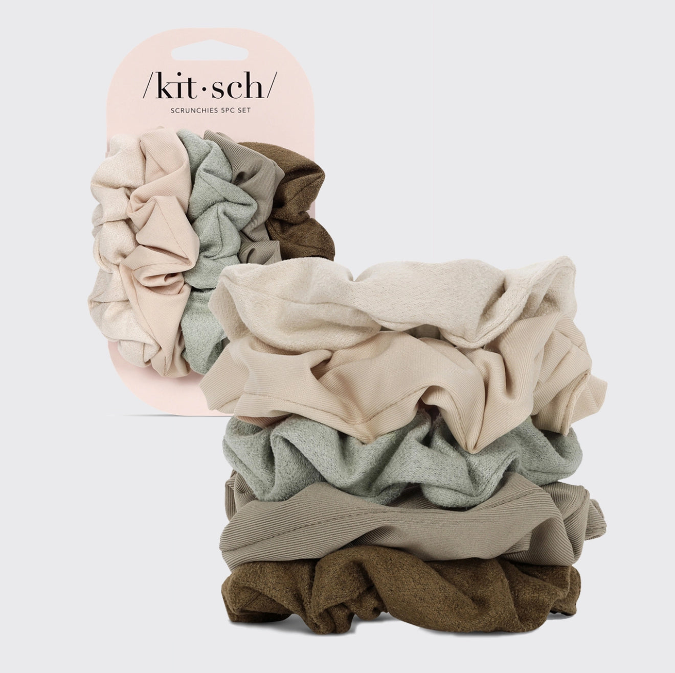 Kitsch Textured Scrunchies 5 Piece Set in eucalyptus, neutral tones.