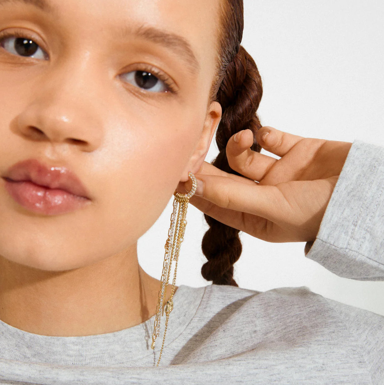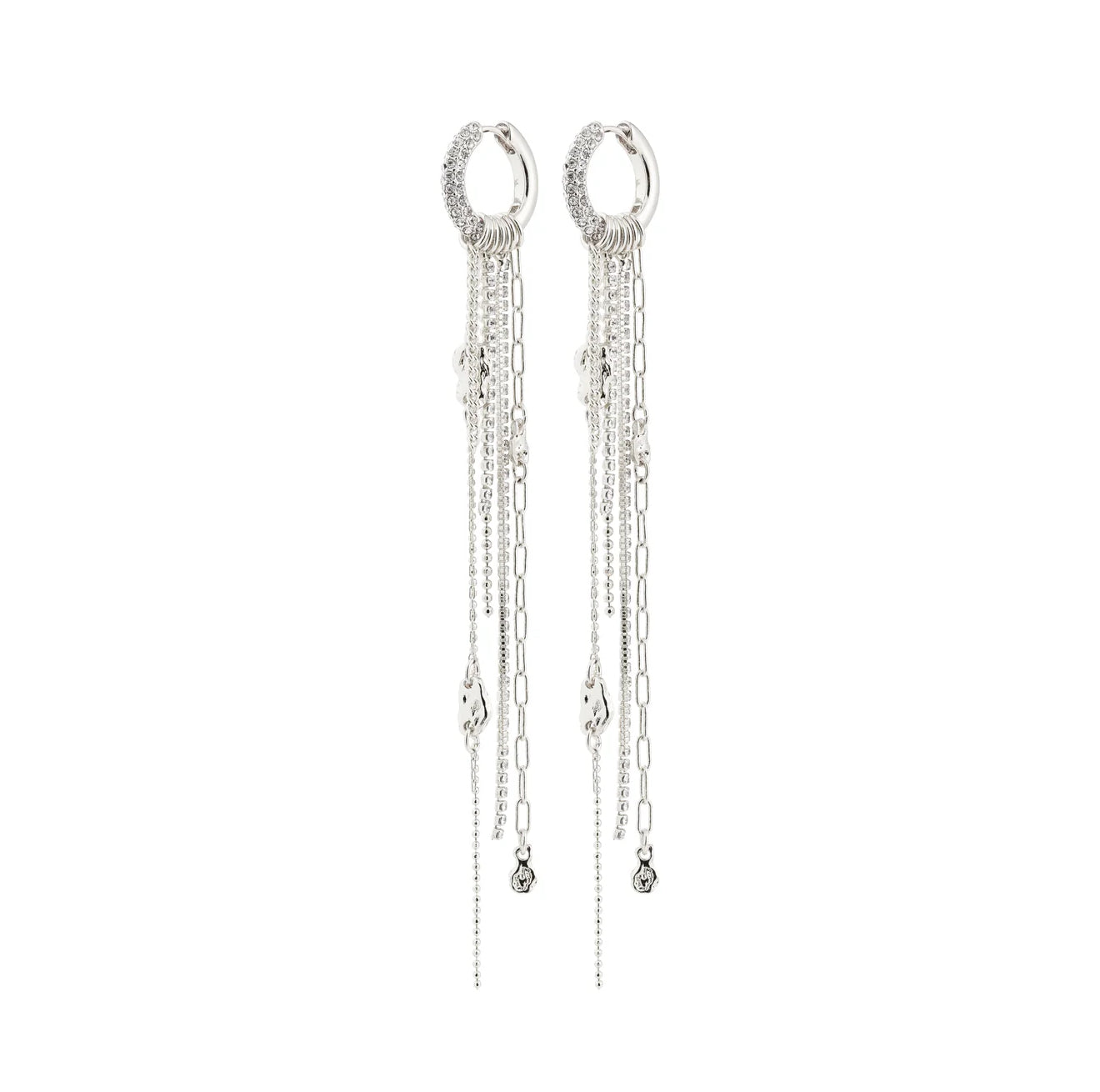 The Pilgrim Drue Long Dangle Earrings are the ultimate go-to for adding a hint of effortless luxury to your look. Measuring a striking 125mm in length, these shoulder duster chain earrings feature small hoops adorned with sparkling Preciosa crystals. The design transitions into a fluid cascade of chains and fine pendants, secured by a comfortable snap lock. Available in gold or silver plated finishes, this long statement jewelry set is consciously made from recycled material. The resulting movement of these long chain earrings creates a show-stopping effect perfect for any special occasion.