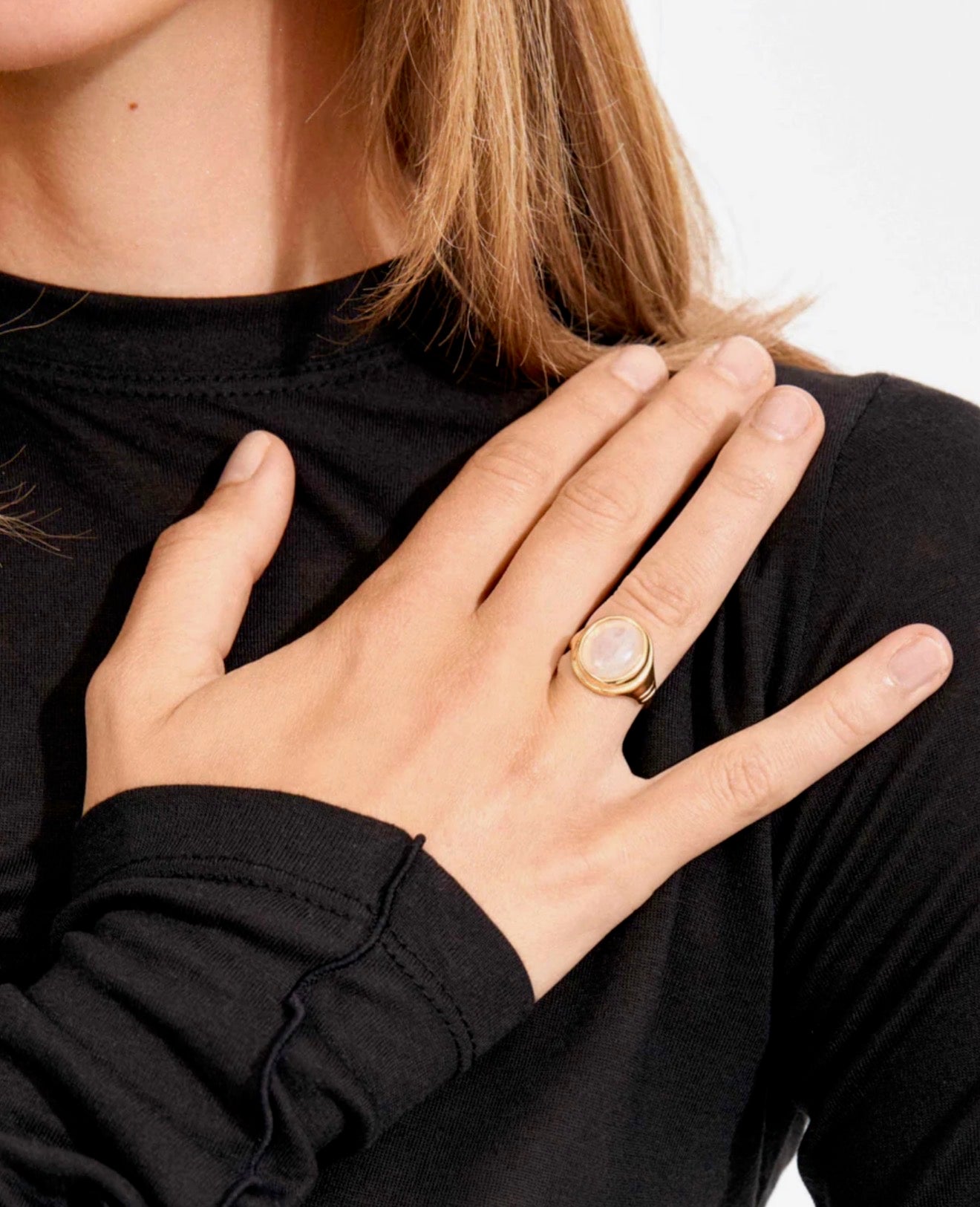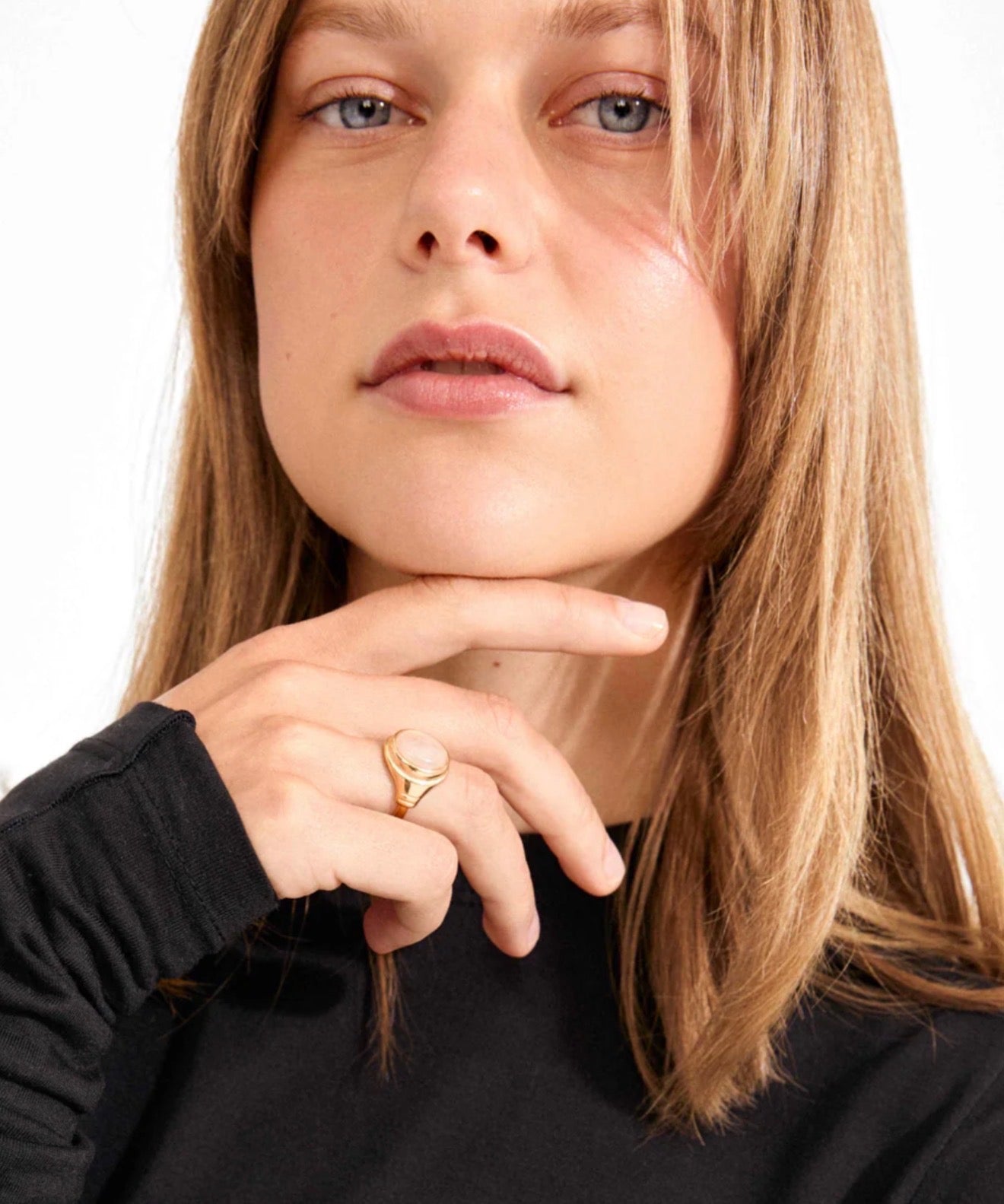 A vintage-meets-ritual sigil on your finger — featuring an oval rose quartz semi-precious stone- said to nurture heartfelt connections and open your spirit to calm and presence, it naturally channels romance. This vintage inspired design is curated for self love.