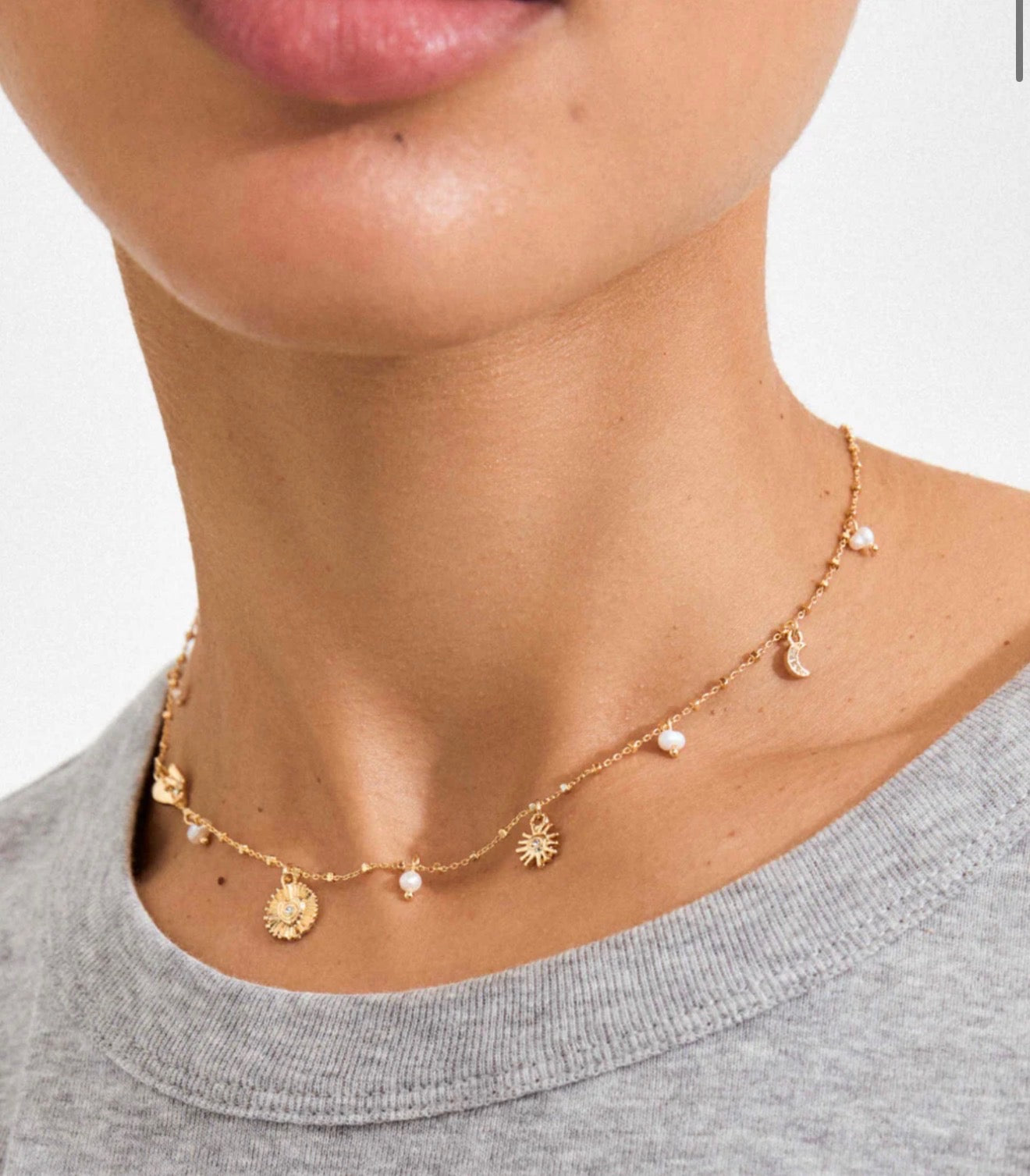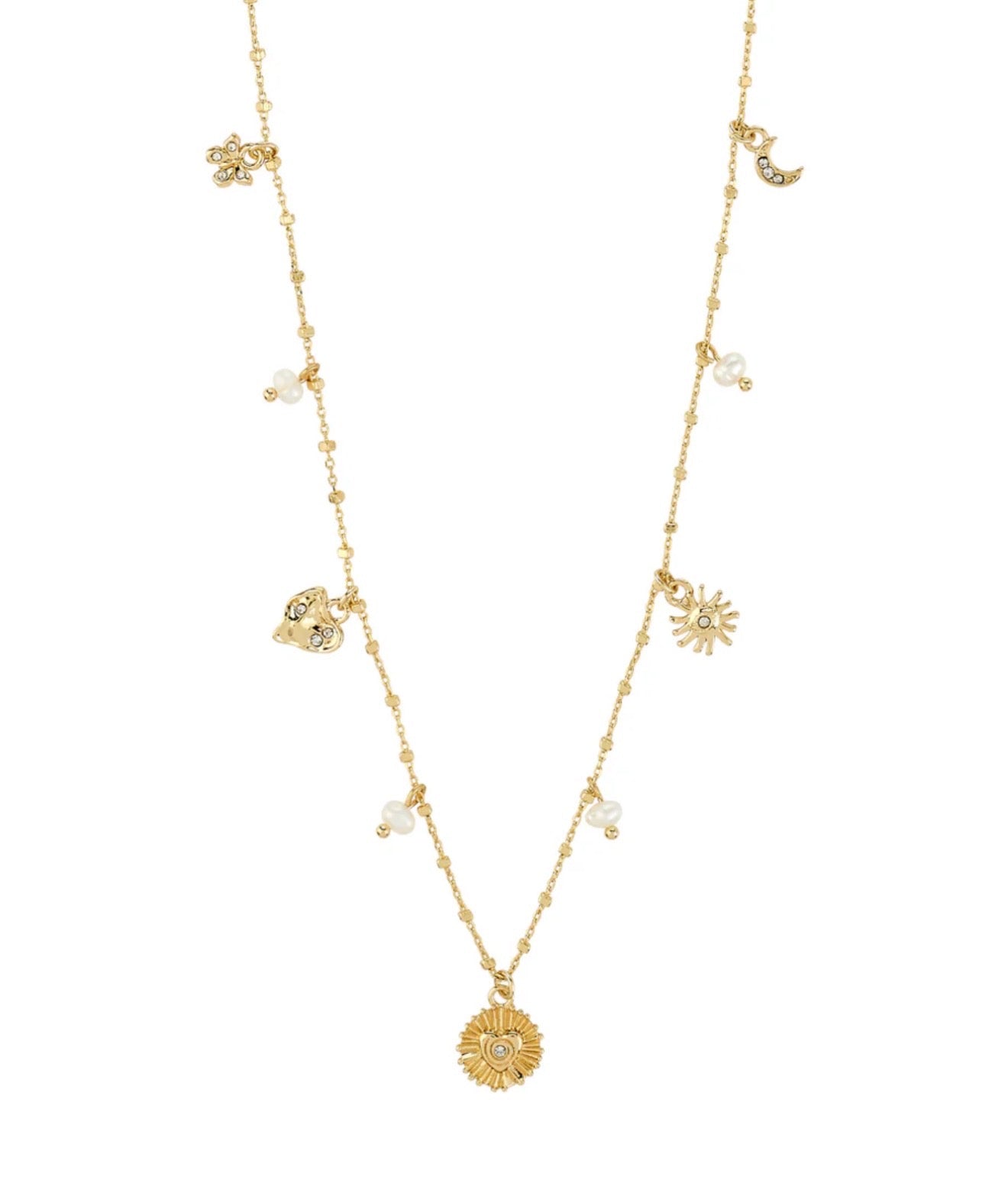 Cosmic charms meet street-ready polish — the Pilgrim Mylan Crystal Charms Necklace strings celestial medals, pearls and crystal energy onto a sleek chain. Featuring a sun, moon, pearls and intricate pendants and a touch of magical glow. It’s a high-vibe amulet for the everyday dreamweaver: layer it hard or let it glint solo against leather and linen. Made from 99% Recycled Materials.