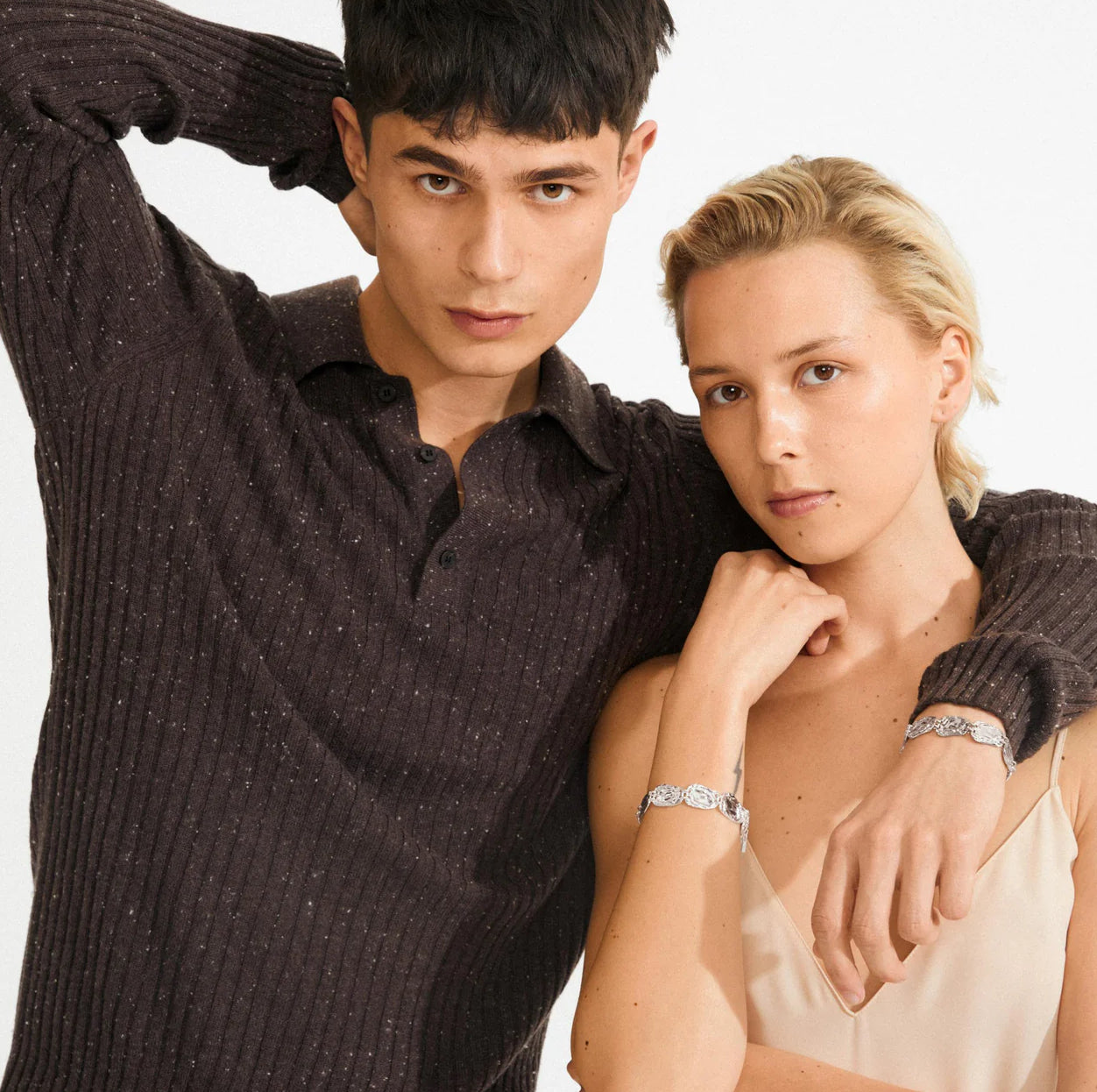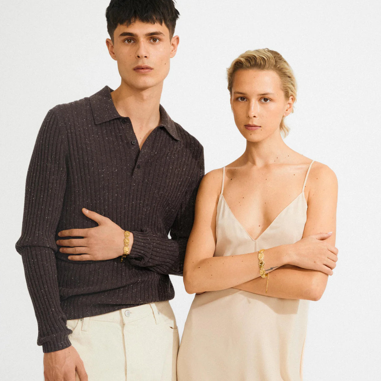 Design: Assembled from flat wavy coin link sections with a unique raw textured surface.