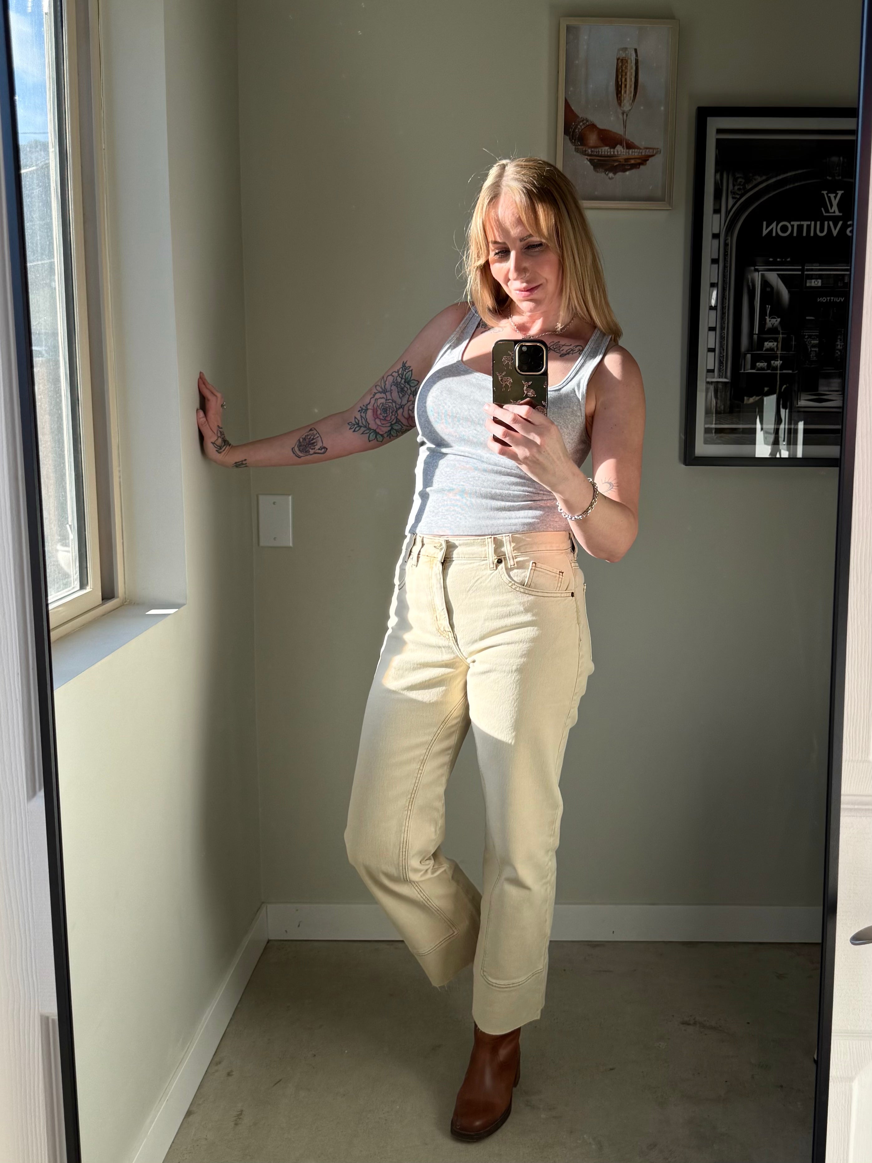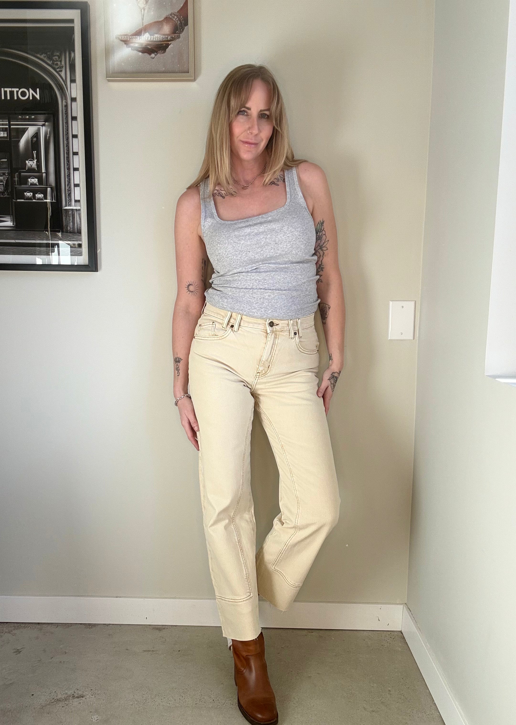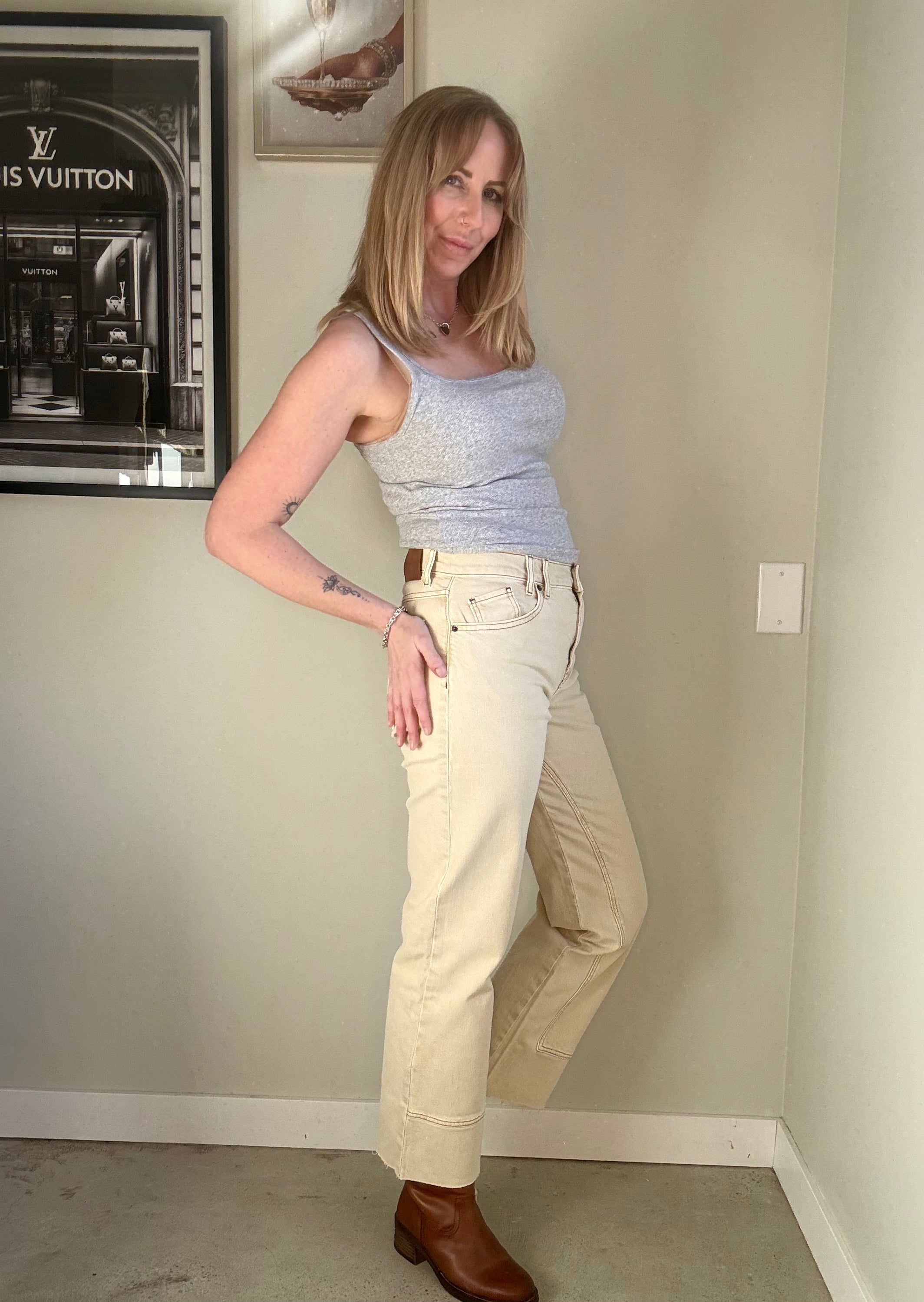 A soft-edged everyday essential in creamy ecru — these mid-rise, straight-leg jeans sculpt a flattering silhouette with lived-in ease. Finished with thoughtful details like a frayed ankle hem and utility seaming, they’re the go-to for both polished and off-duty outfits.