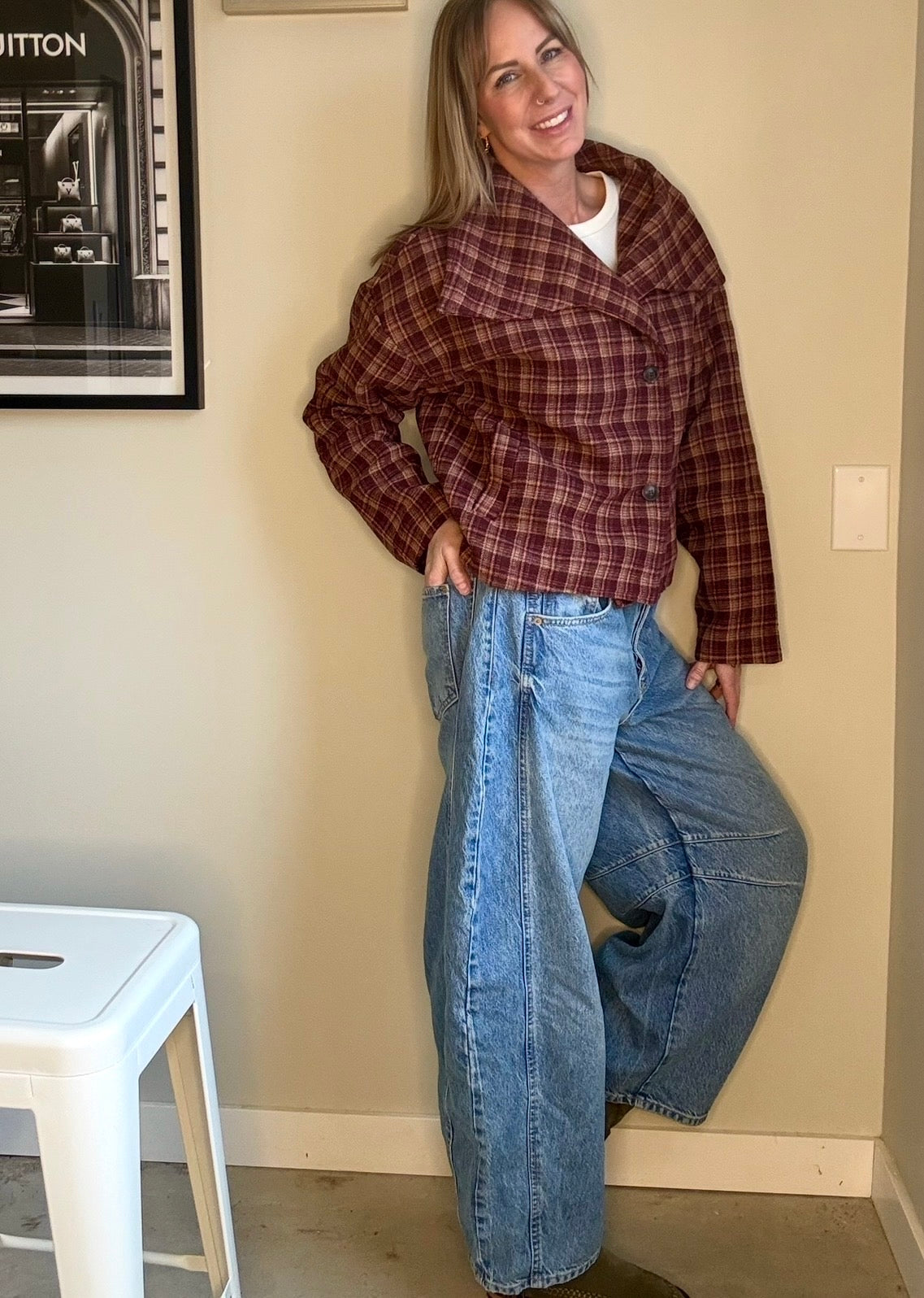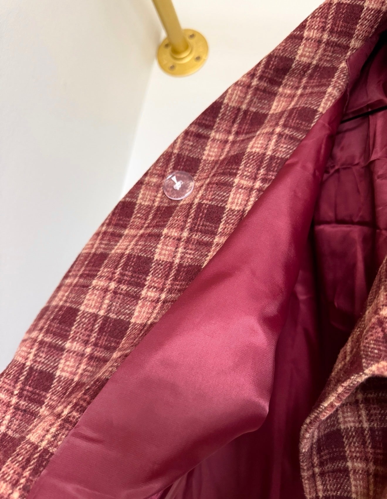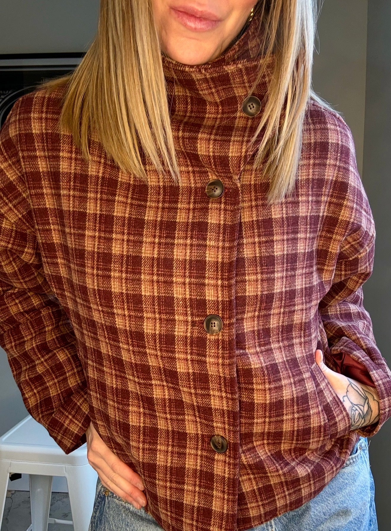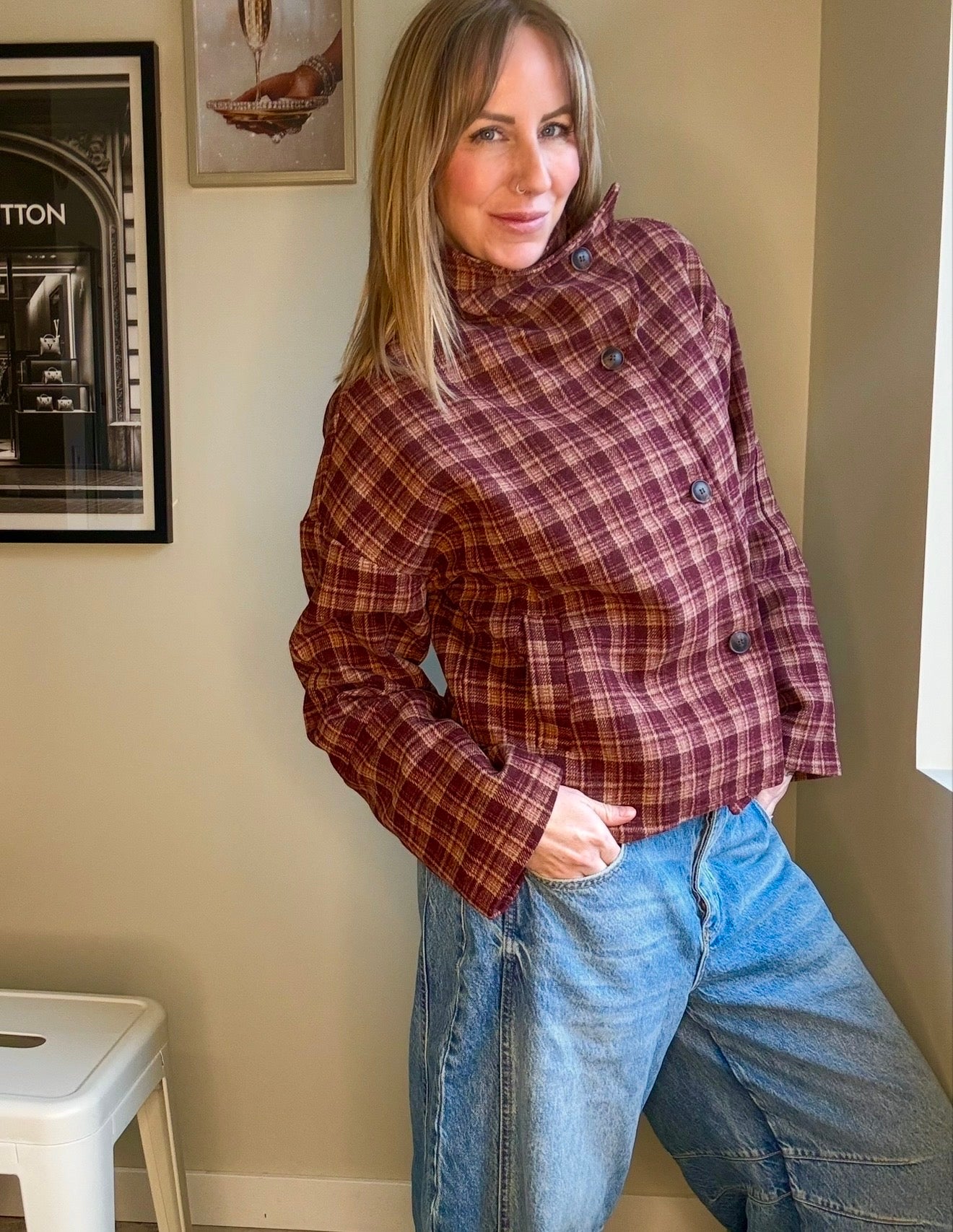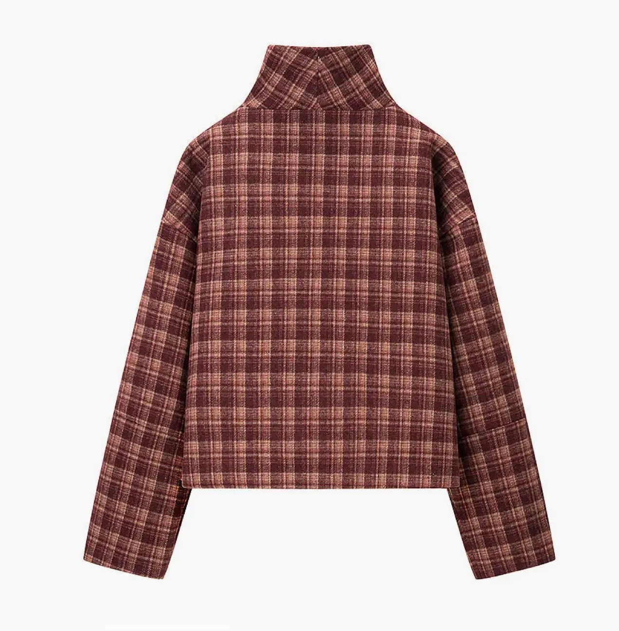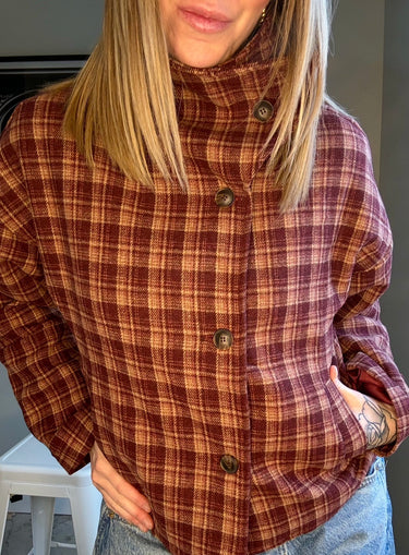 88 Checkered Stand Collar Jacket in classic checkered pattern of red and burgundy colouring. Stand collar design with single breasted front. Short length jacket and long sleeves. Fits true to size. Wear the collar up or down with this transitional capsule wardrobe piece. Pair it with denim, trousers or a skirt!