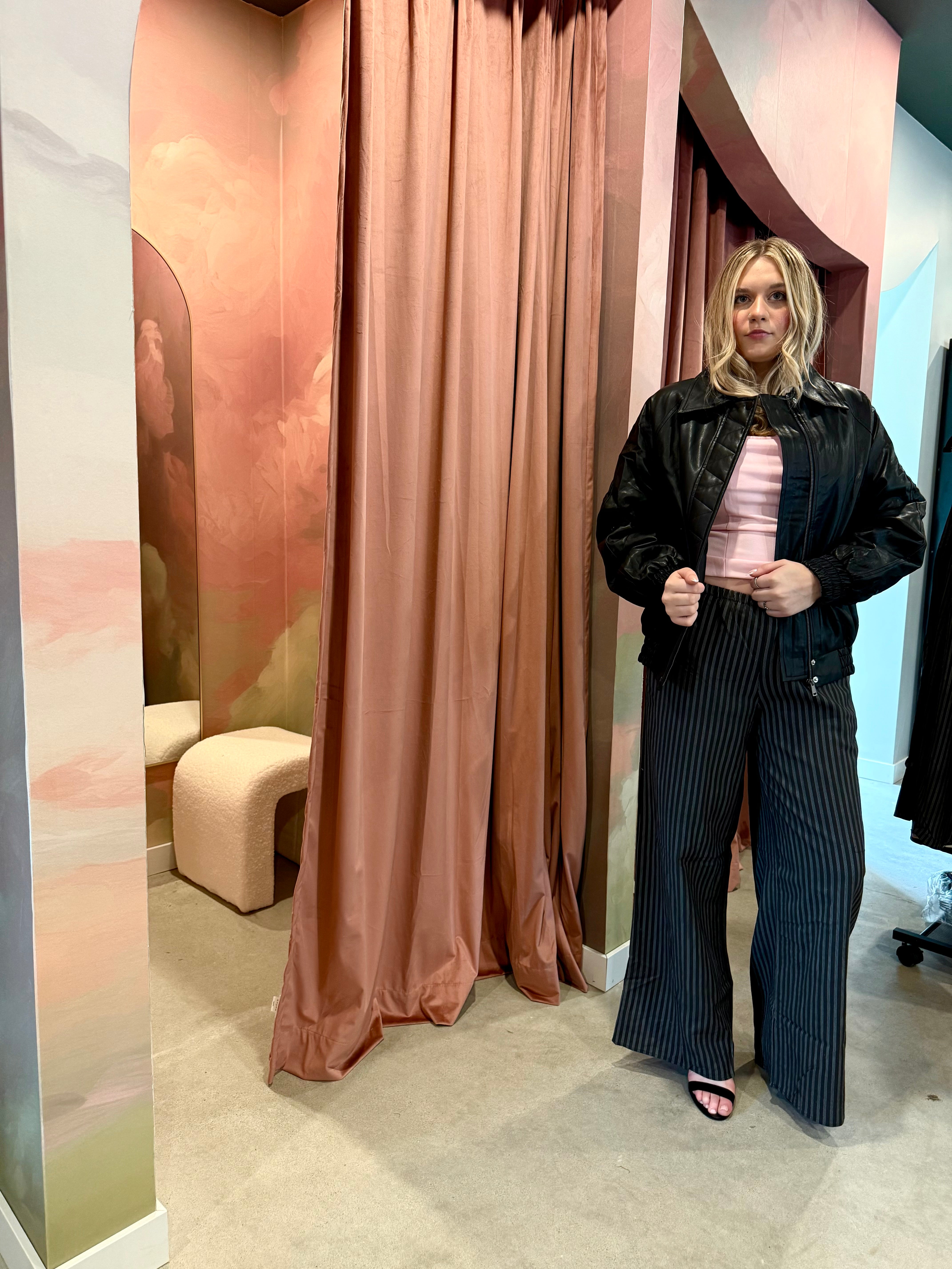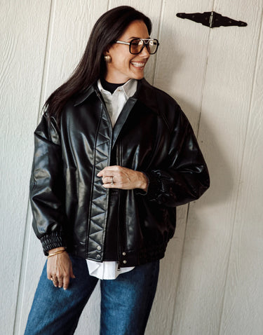 Meet the perfect Oversized Vegan Leather Bomber—A relaxed, oversized vegan leather bomber with a smooth, elevated finish. Quilted for warmth and designed for easy layering, it adds a confident edge to both casual and polished looks.