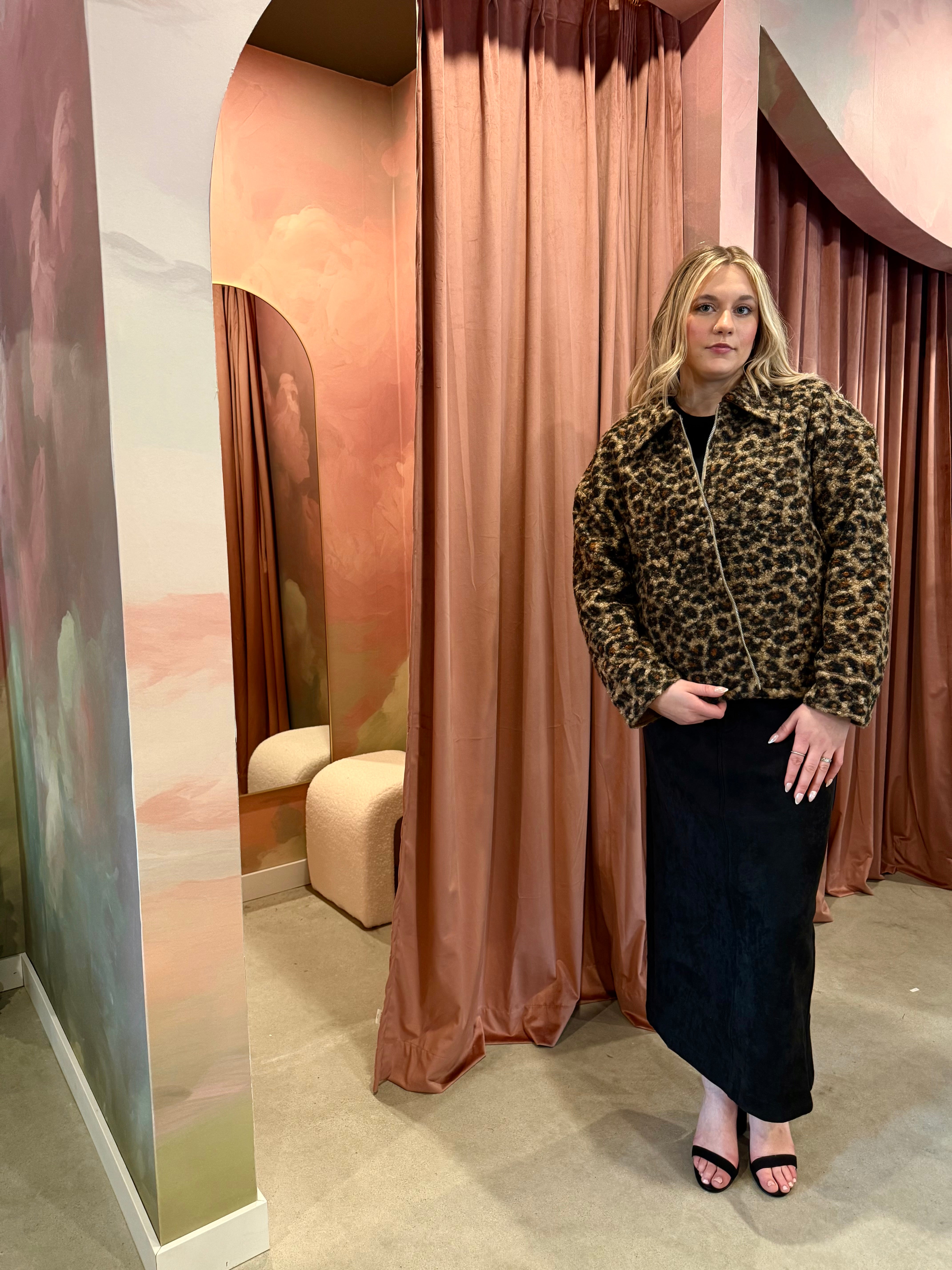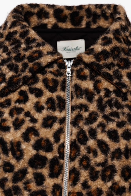 An oversized sherpa shacket with a bold leopard print and an easy, boxy silhouette. Warm, cozy, and designed for layering, it brings a confident edge to everyday cold-weather styling.