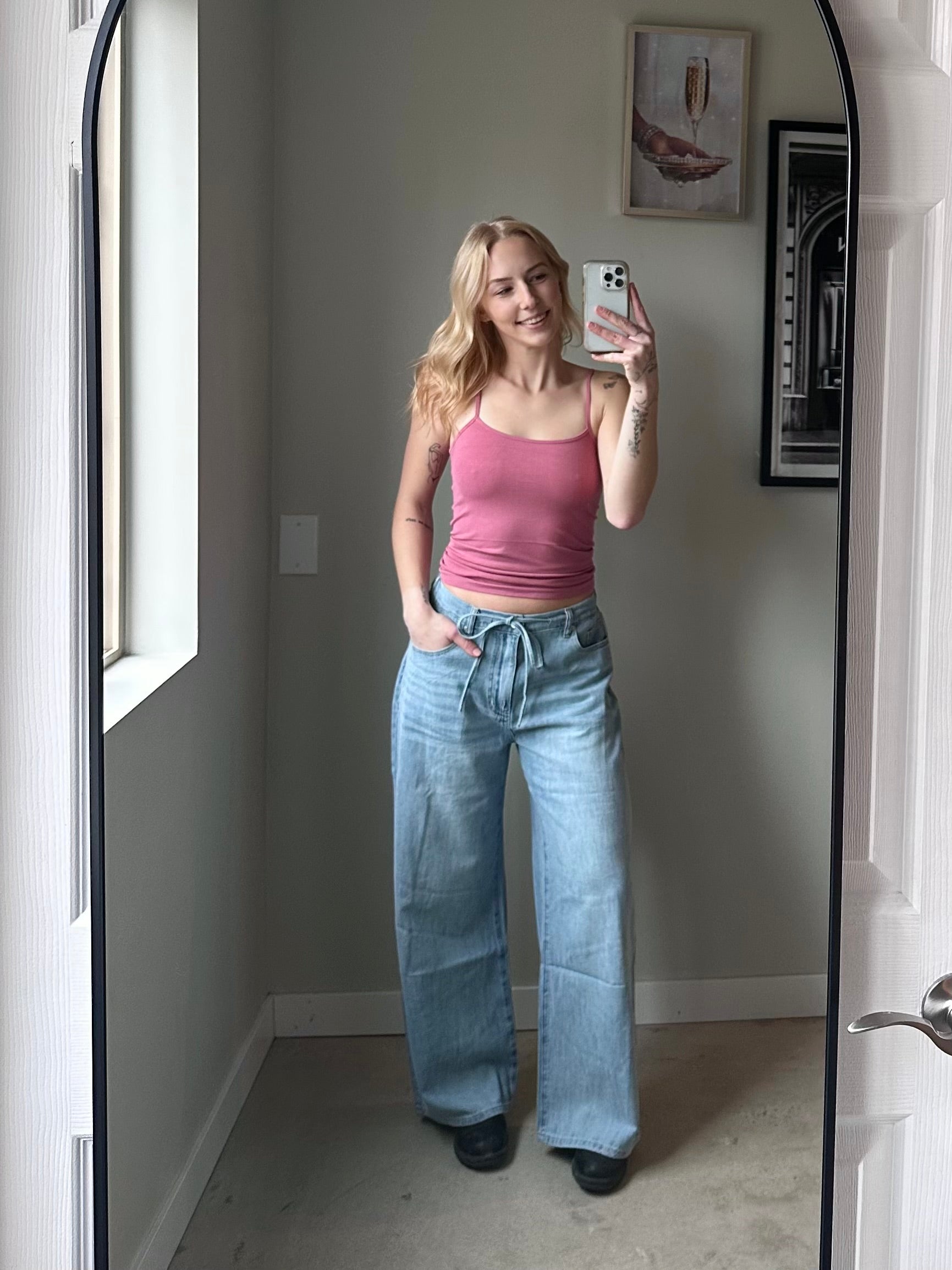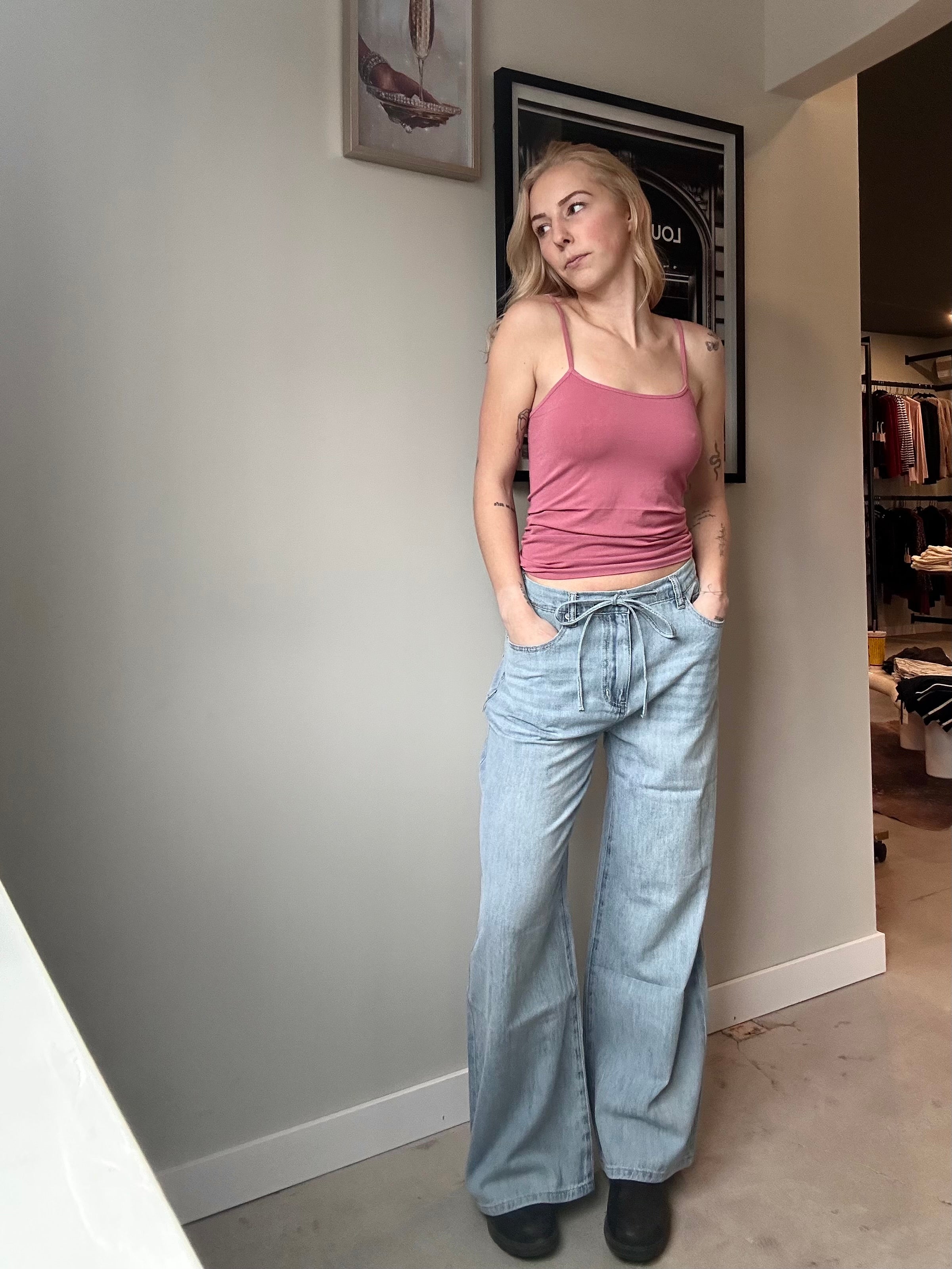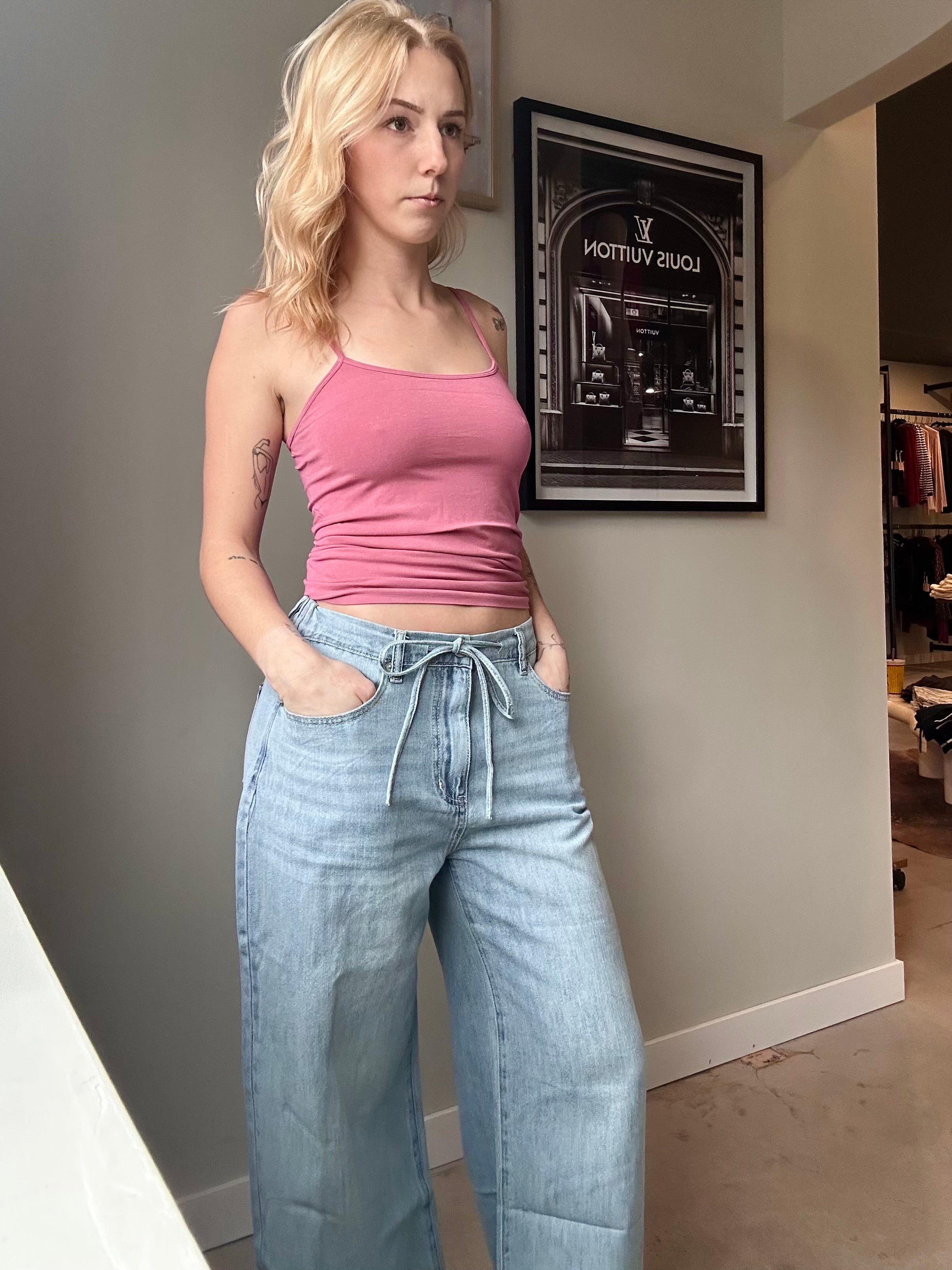Vintage edge meets effortless cool. These 100% Cotton wide-leg denim style pants have a relaxed fit for ultra comfort. Featuring elastic waistband in the back and front drawstring, and pockets in the front and back. Style them with a fitted tank or oversized knit. The perfect blend of vintage comfort and modern style.