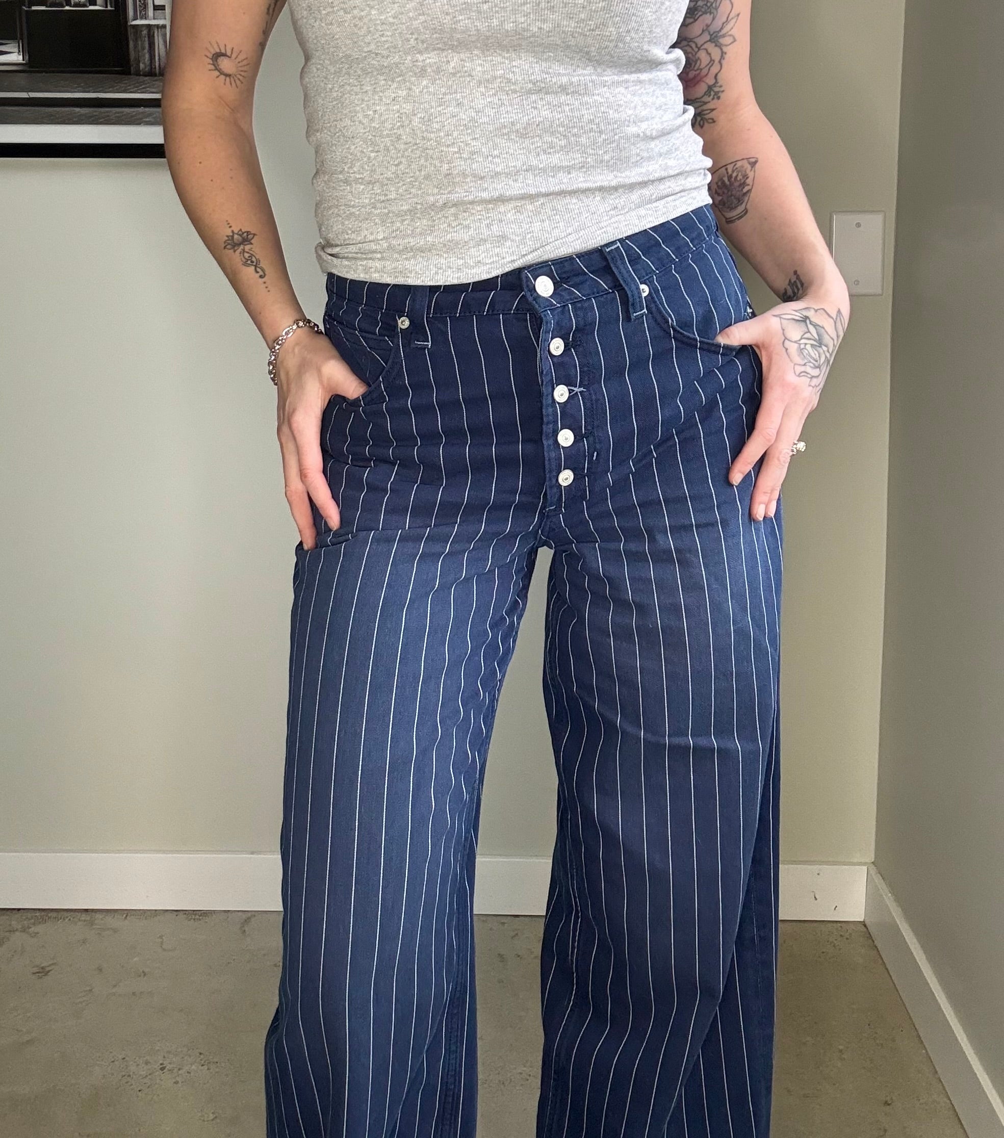 A relaxed boyfriend fit and five star We The Free fave, now with subtle pinstripes and just-worn structure, designed to sit mid rise and feel effortless. Slouchy, cool, and intentionally undone — these are the kind of jeans that make the outfit without trying.