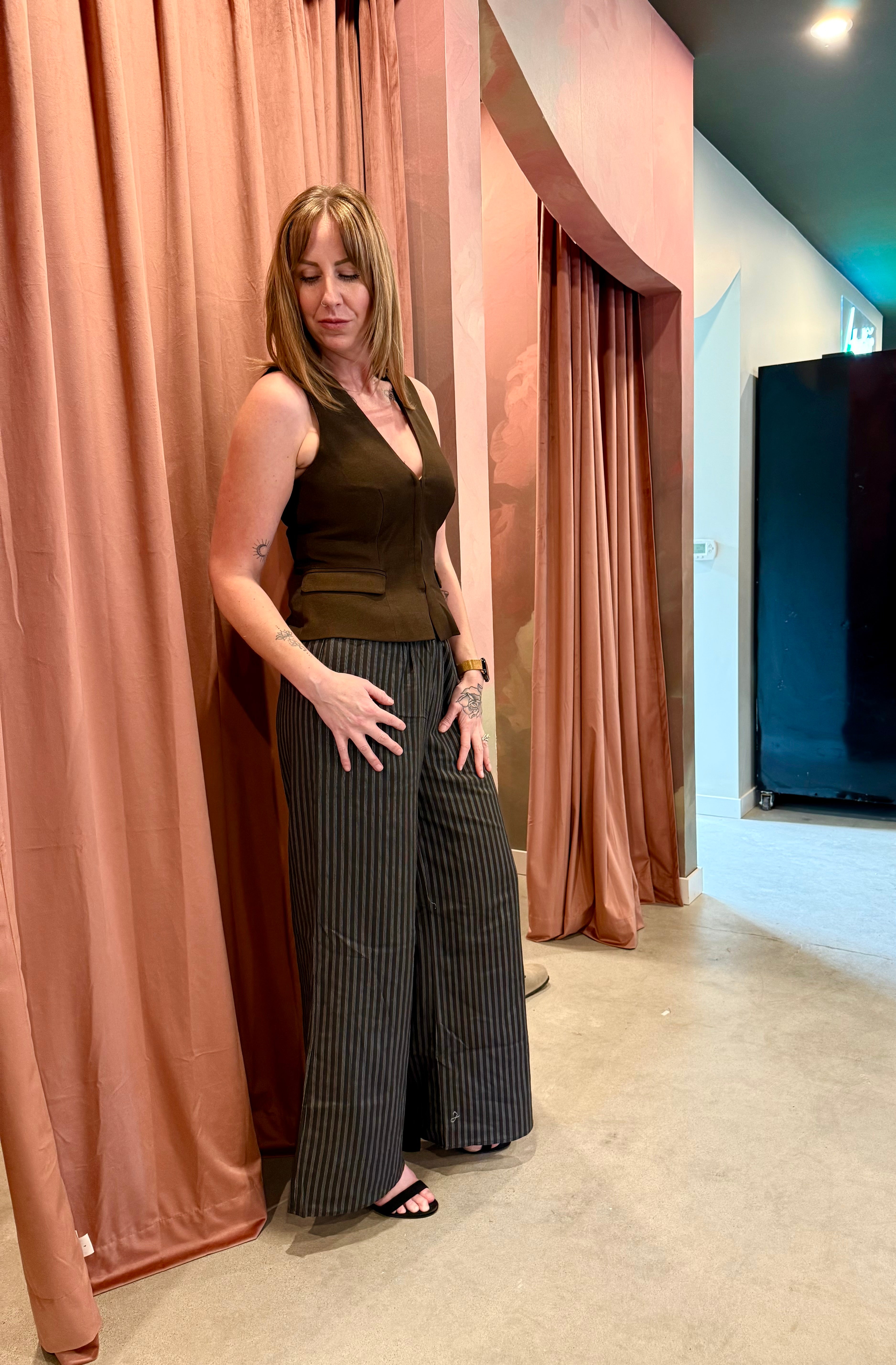 The Runaway The Label Pinstripe Wide Leg Pant is an easy-to-style, timeless staple for your modern wardrobe. These low waisted wide-leg linen blend trousers are crafted from a soft, textural blend of Polyester, Rayon, and Linen, ensuring a comfortable drape. The classic pinstripe features a comfortable low waisted fit and a flattering wide-leg silhouette. Fully lined with 100% Cotton for breathability, this bottom is the perfect piece to blend comfort and polished style.