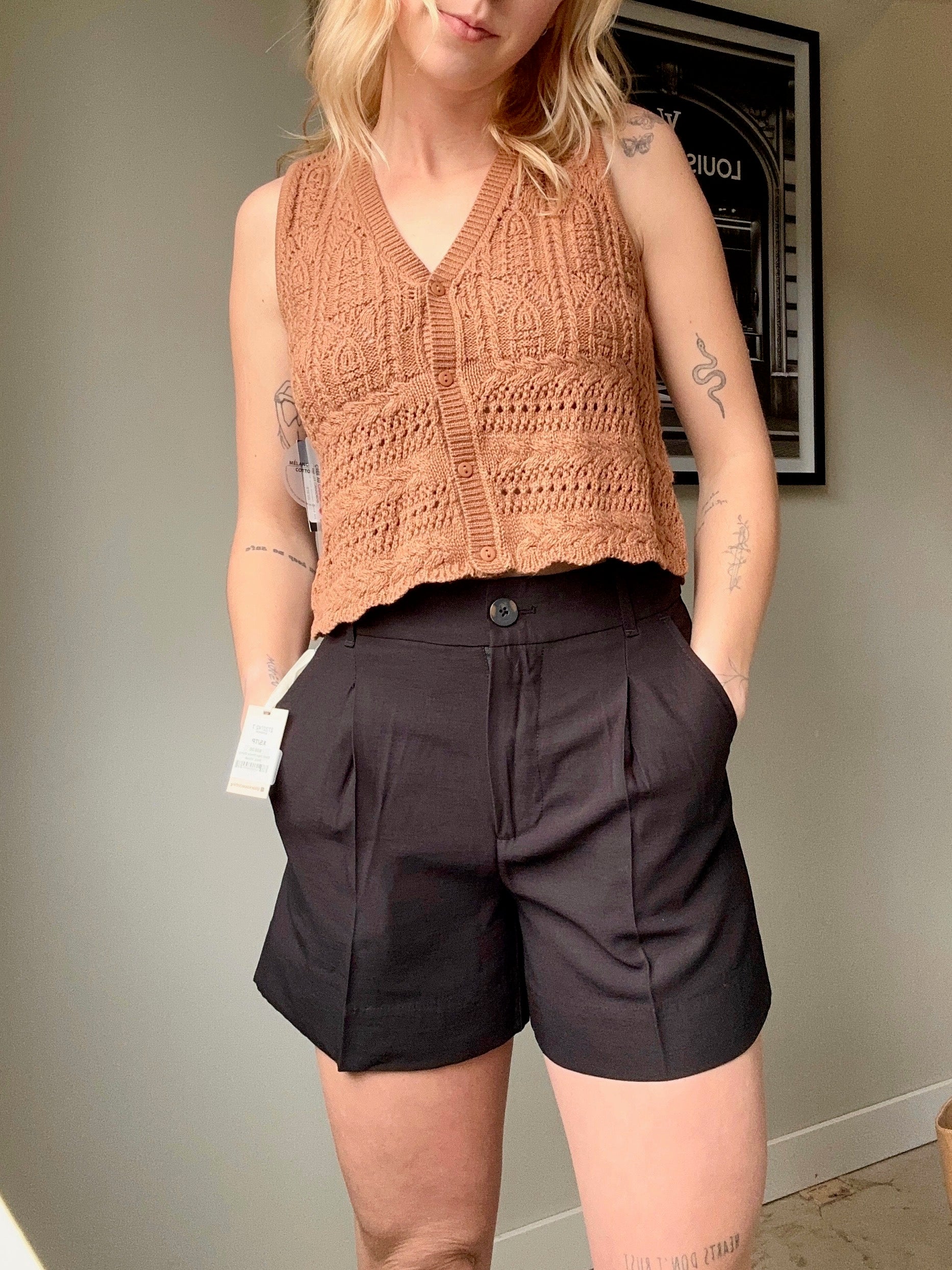 Tailored with a little attitude. These high-waisted shorts bring a sleek, dressy edge that takes you from daytime polish to night-out cool. In classic black, featuring front pleating and belt loops. These are the ultimate trouser short, and perfect capsule wardrobe addition.
