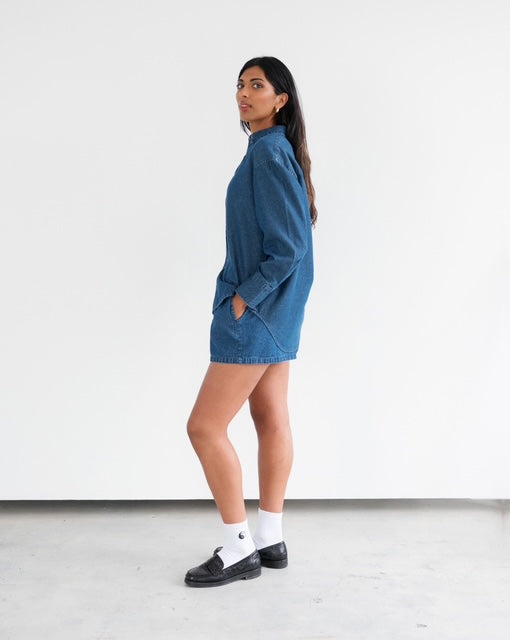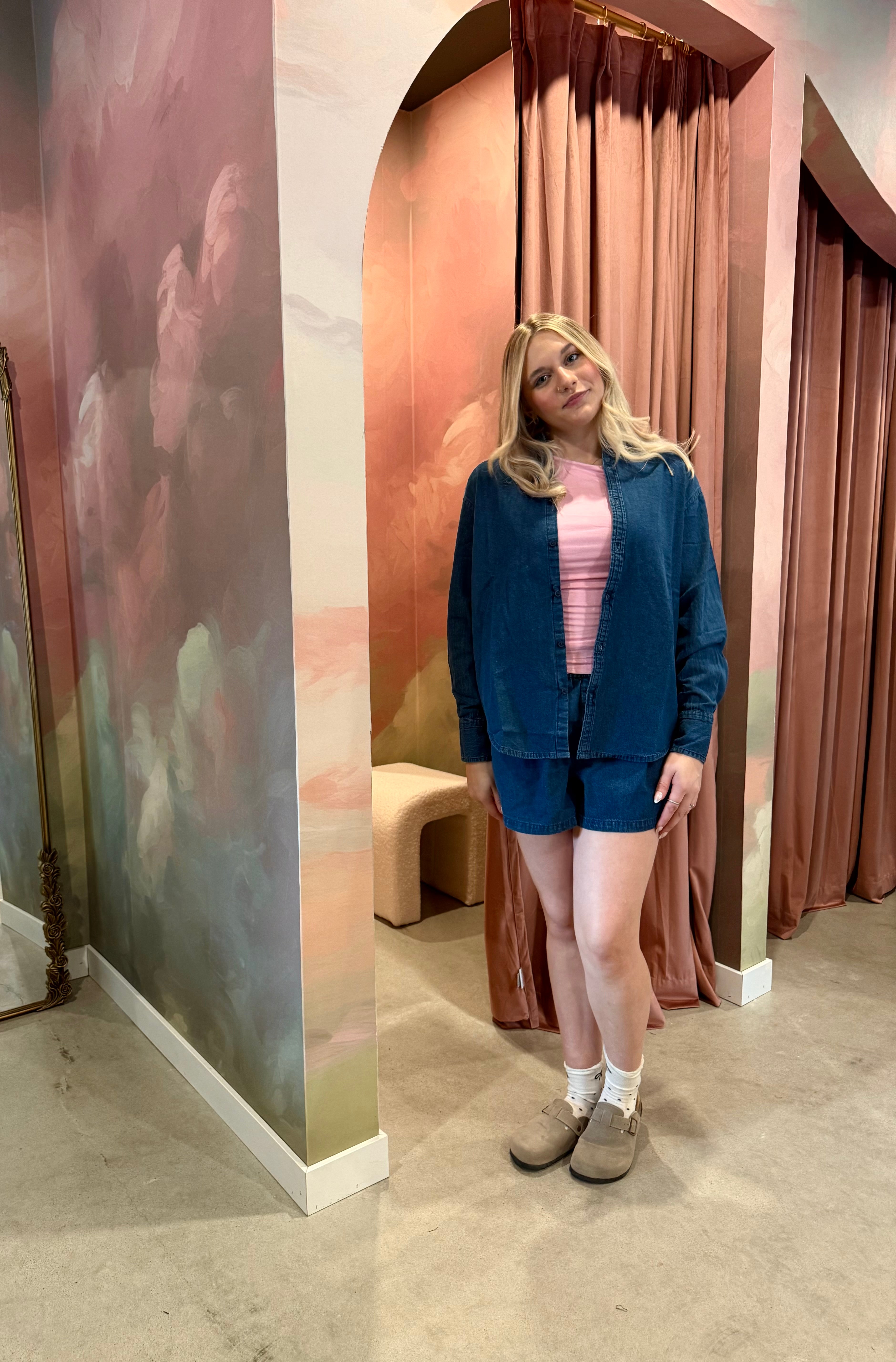 Relaxed, borrowed-from-the-boys cool. These denim boxer shorts blend lightweight comfort with an elevated vintage wash for an easy, throw-on-and-go feel. Finished with an elastic waist and pockets—made for lounging, styling, and everything in between.