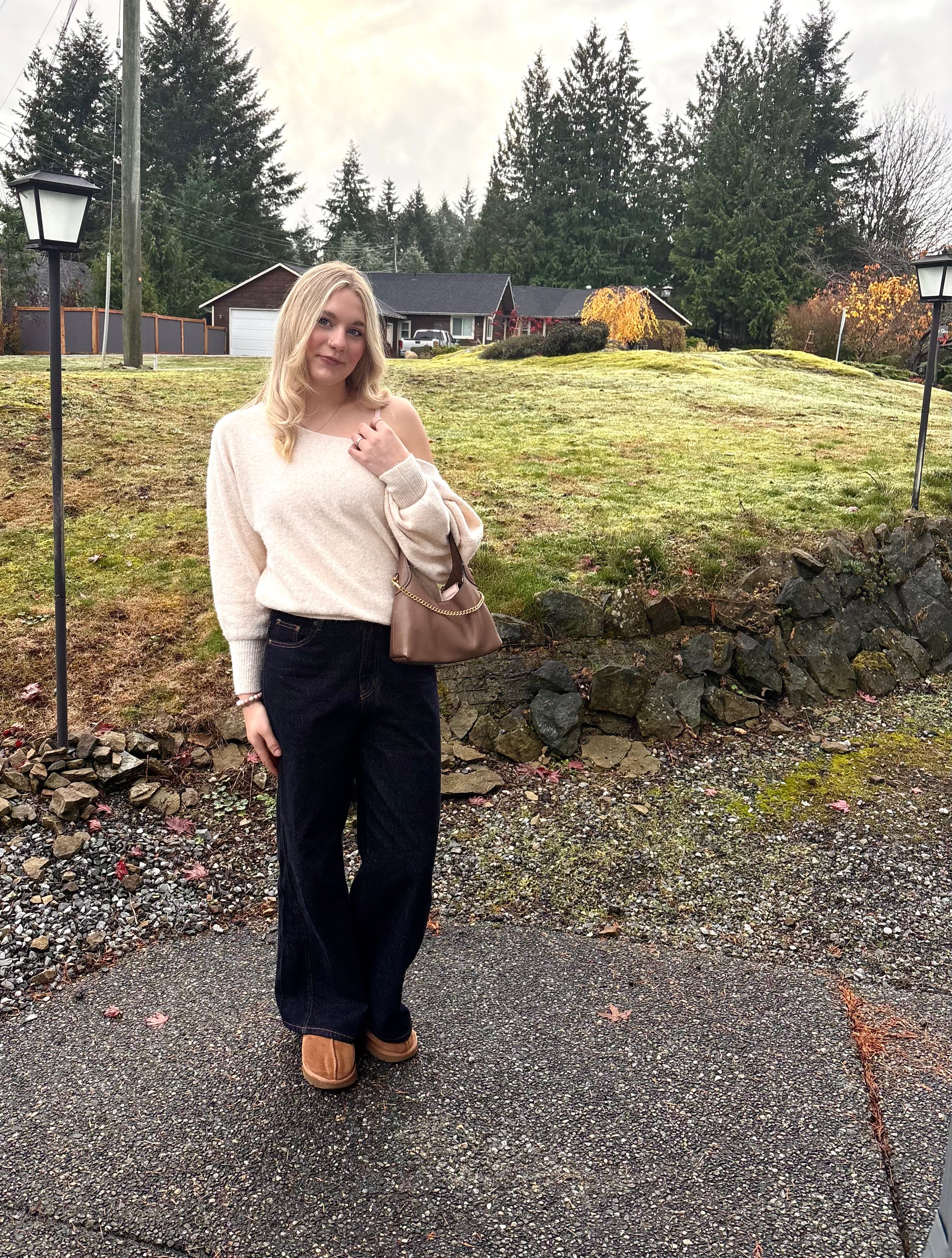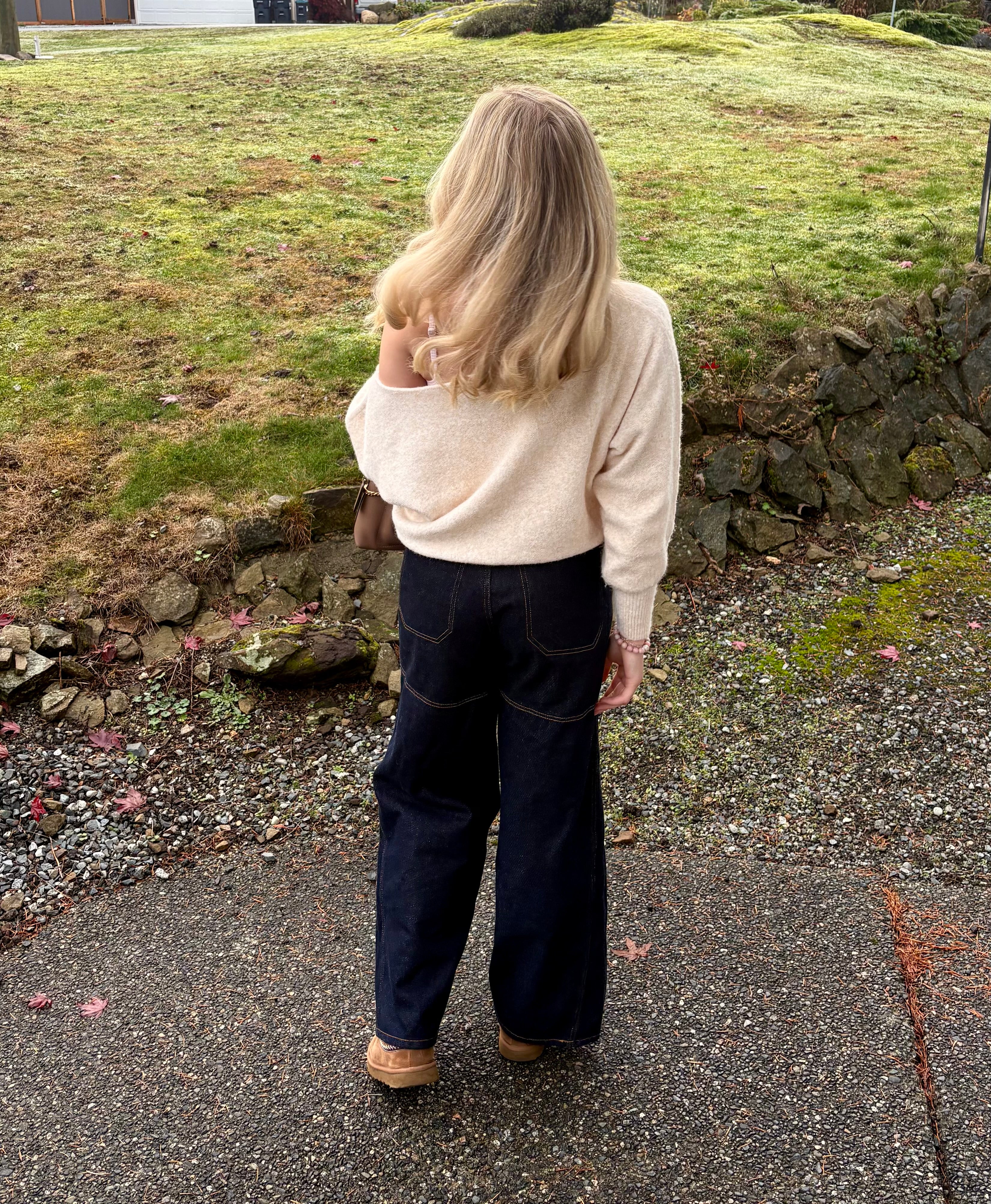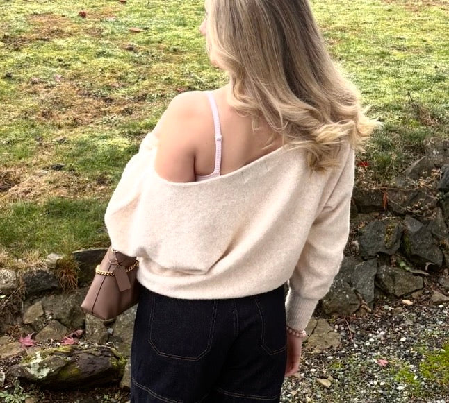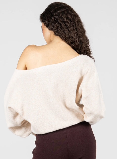 Pair this soft open neck sweater with slim trousers for a chic contrast in volume, or wear it tucked into a midi skirt for a sophisticated, flowing silhouette.