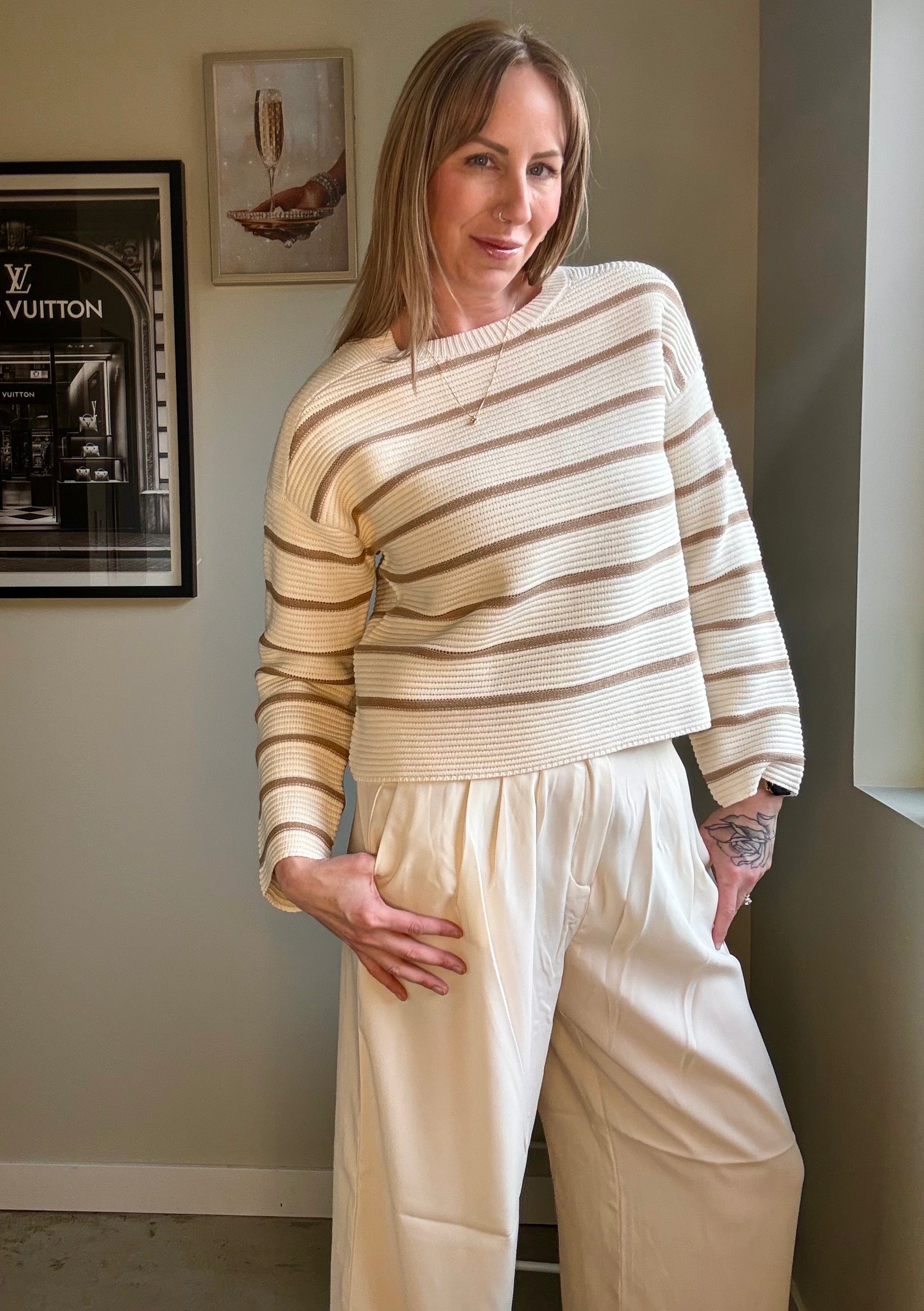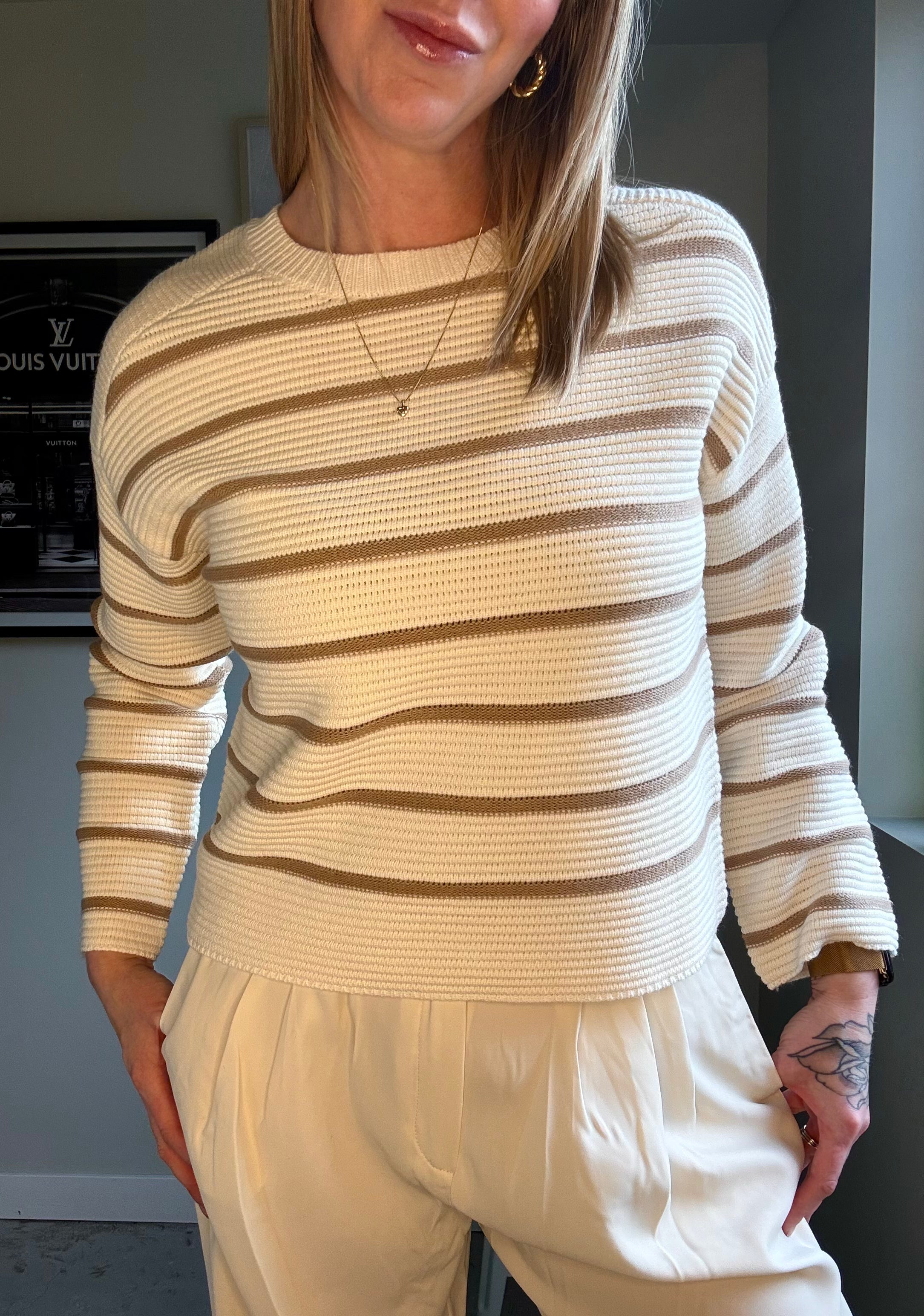 Meet the Dex Cozy Cloud Sweater, your new definition of ultimate comfort. This ultra-soft striped relaxed fit knit is crafted from a luxurious Cotton/Acrylic blend, giving it a light, cloud-like feel. Featuring a generous relaxed fit silhouette, classic crew neck, comfortable dropped shoulders and long sleeves, this pullover is perfect for effortless, everyday styling. Designed as cozy lounge knitwear, it provides warmth and a delightfully soft touch for any laid-back occasion.