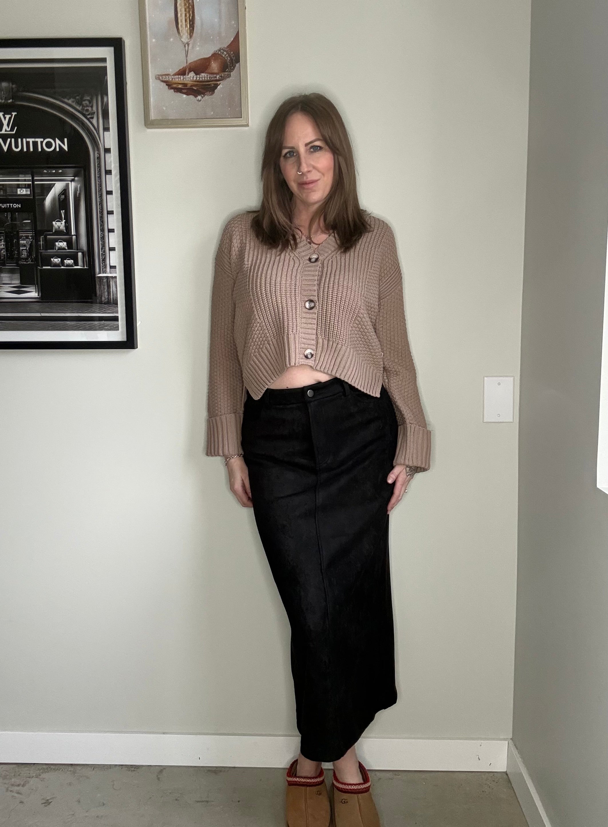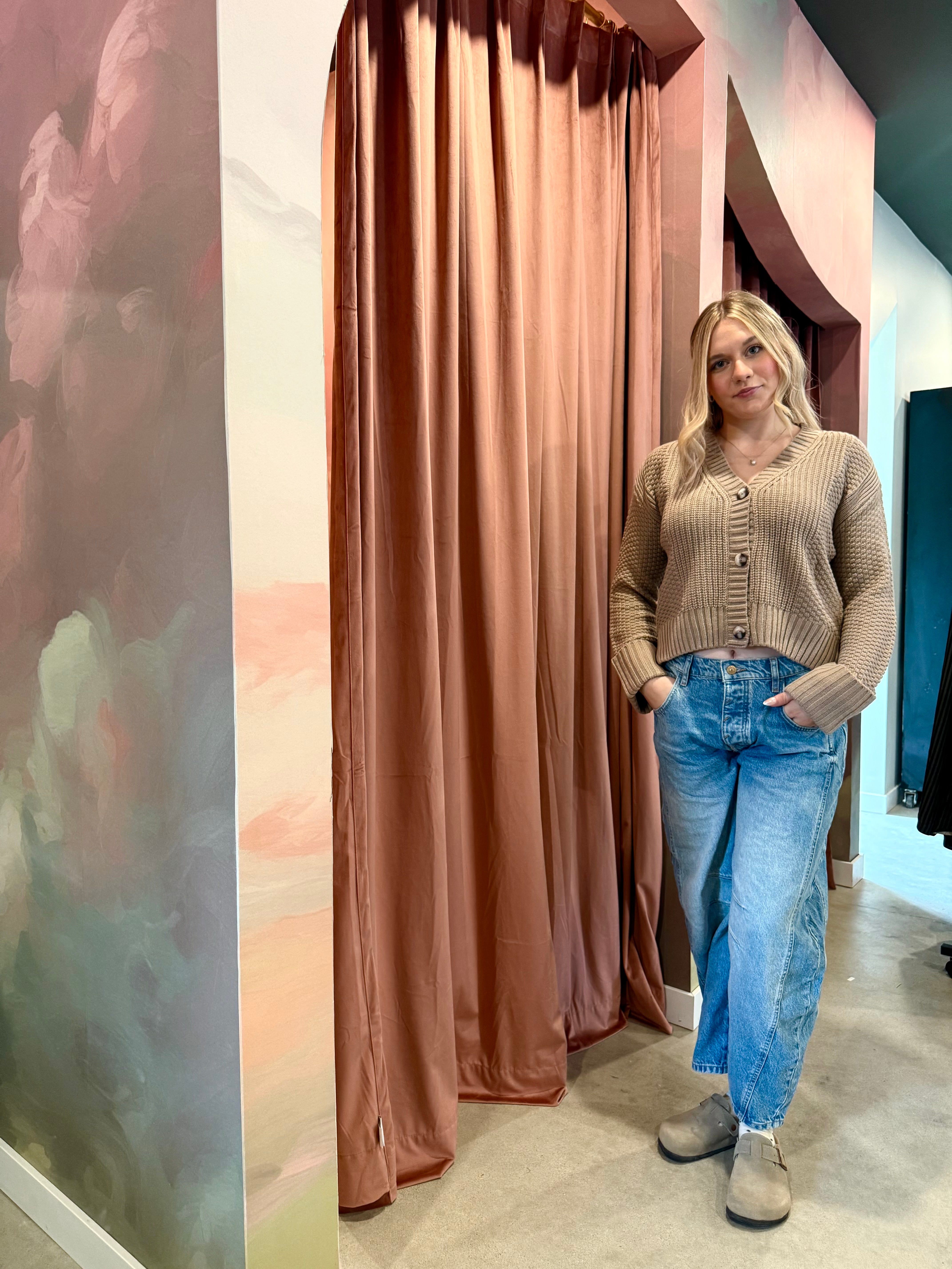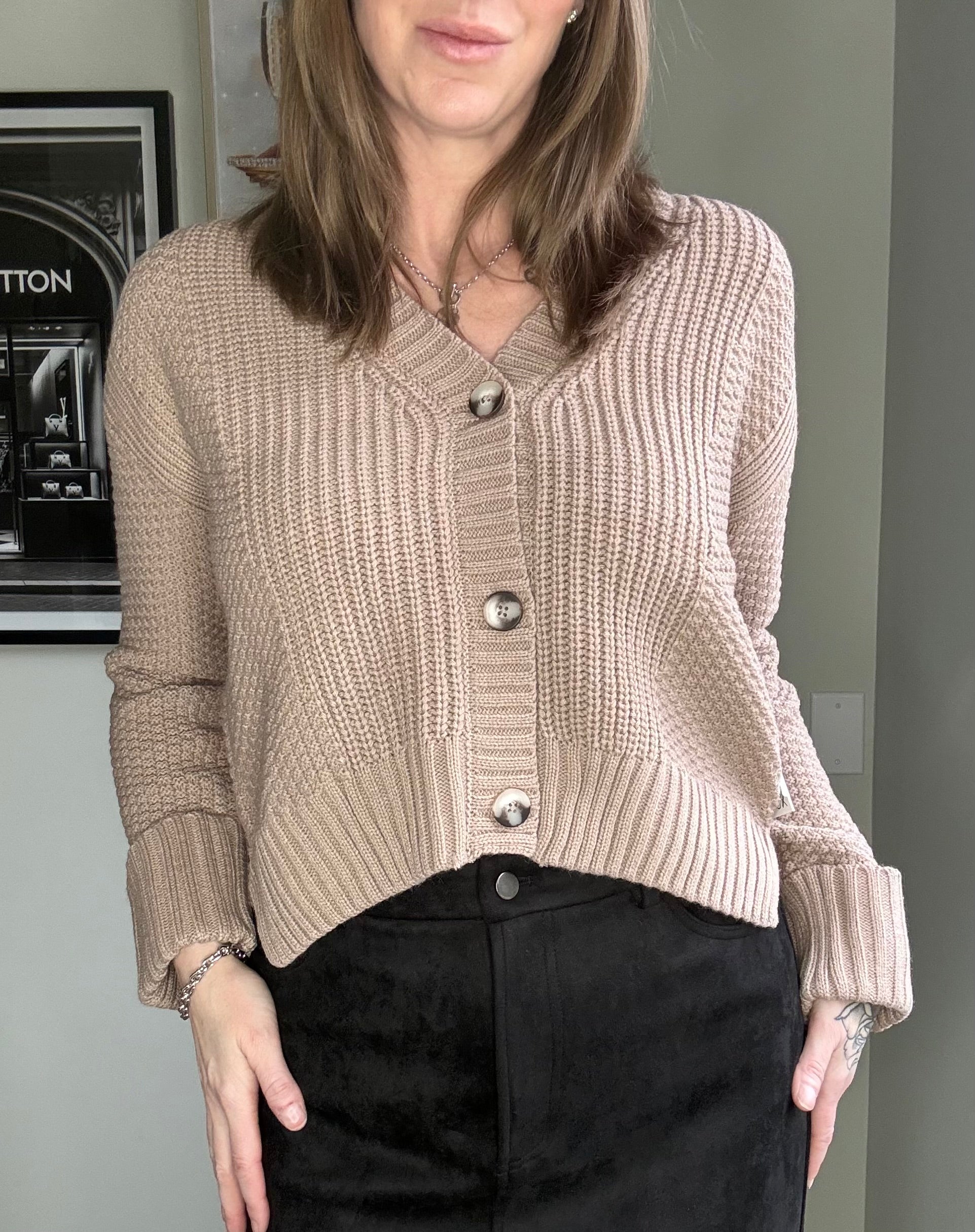 Soft texture, clean lines. This V-neck cardigan features a button-front silhouette with wide cuffed sleeves for an elevated, effortless feel. Easy to layer, easy to wear — polished enough for days, relaxed enough for weekends.