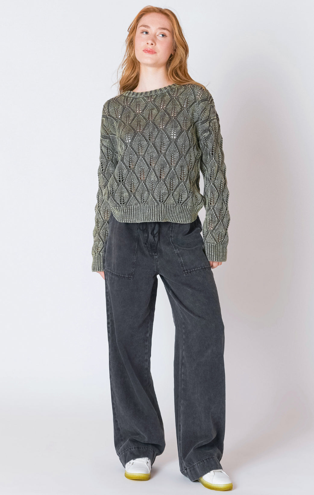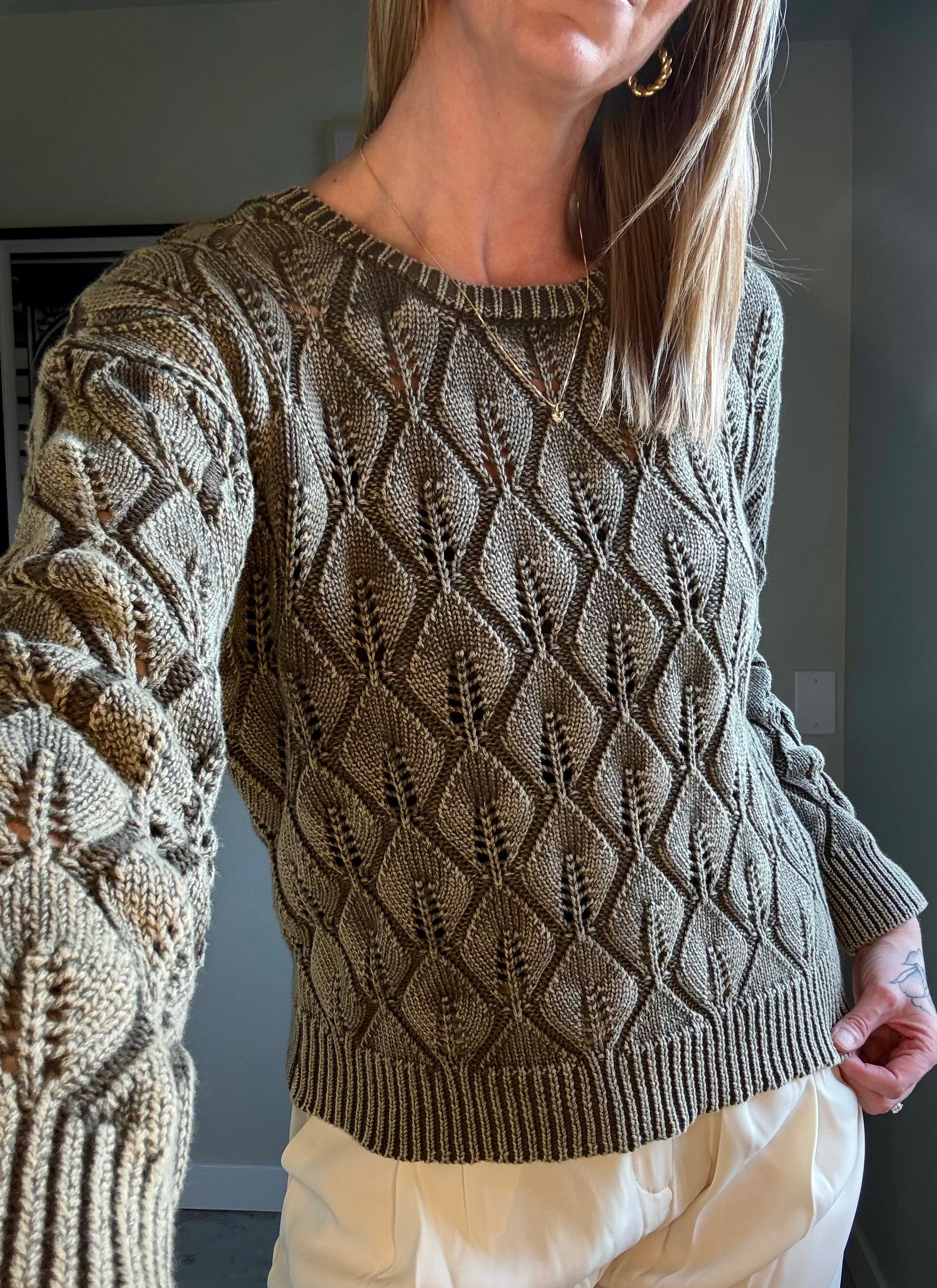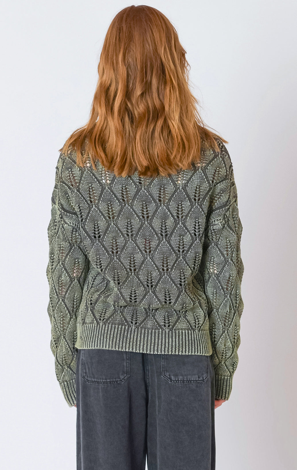 Layer this relaxed fit sweater over a fitted cami and pair with tailored trousers, allowing the delicate pointelle texture to elevate your casual, clean look.