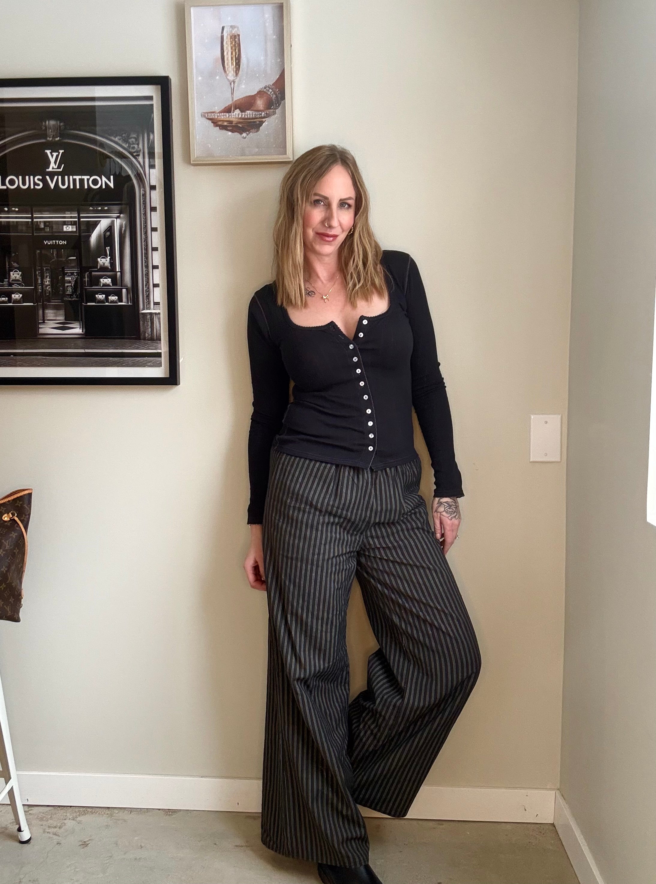 Model is 5"9 wearing a true to size Large in the End Game Pointelle Long Sleeve