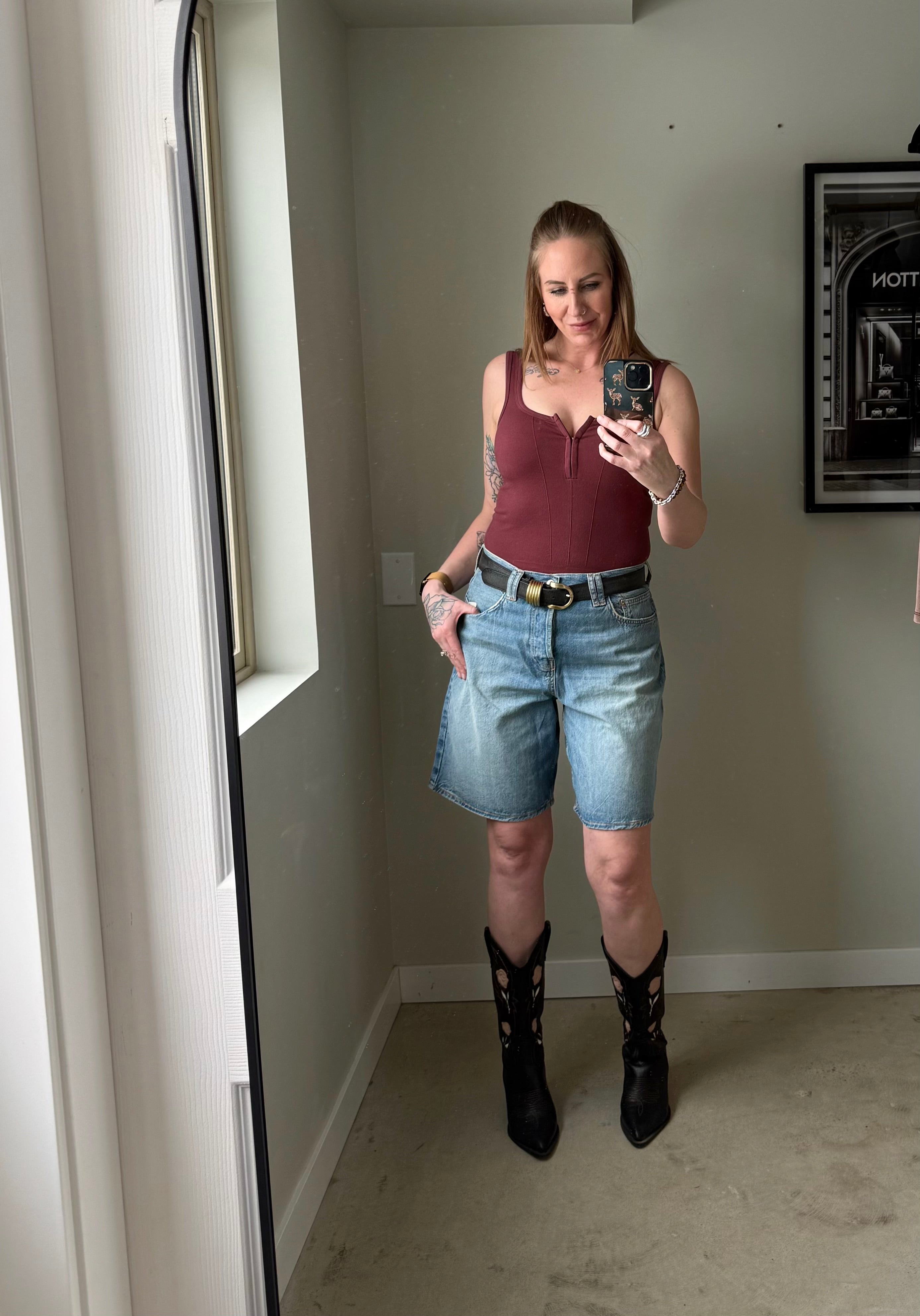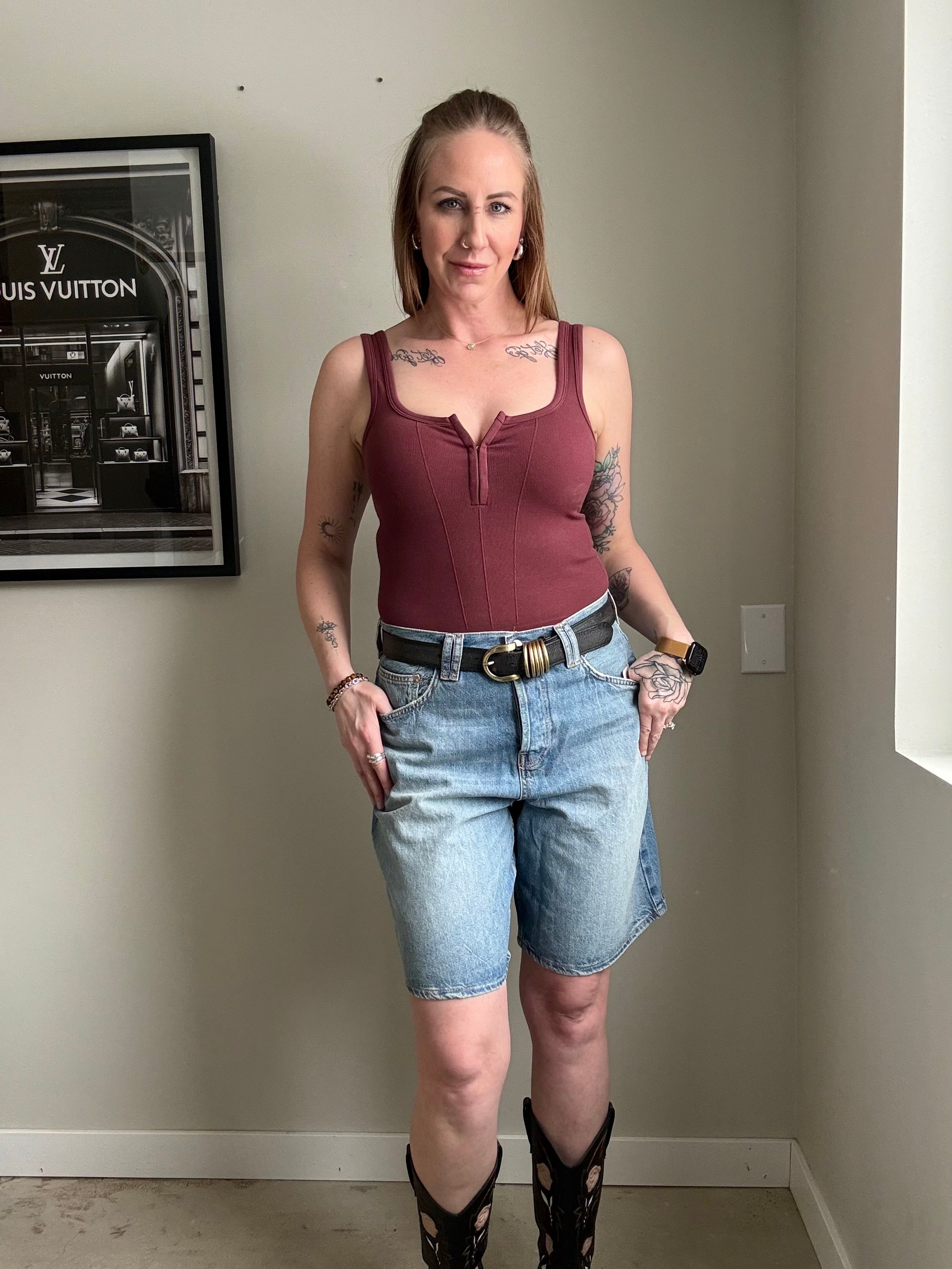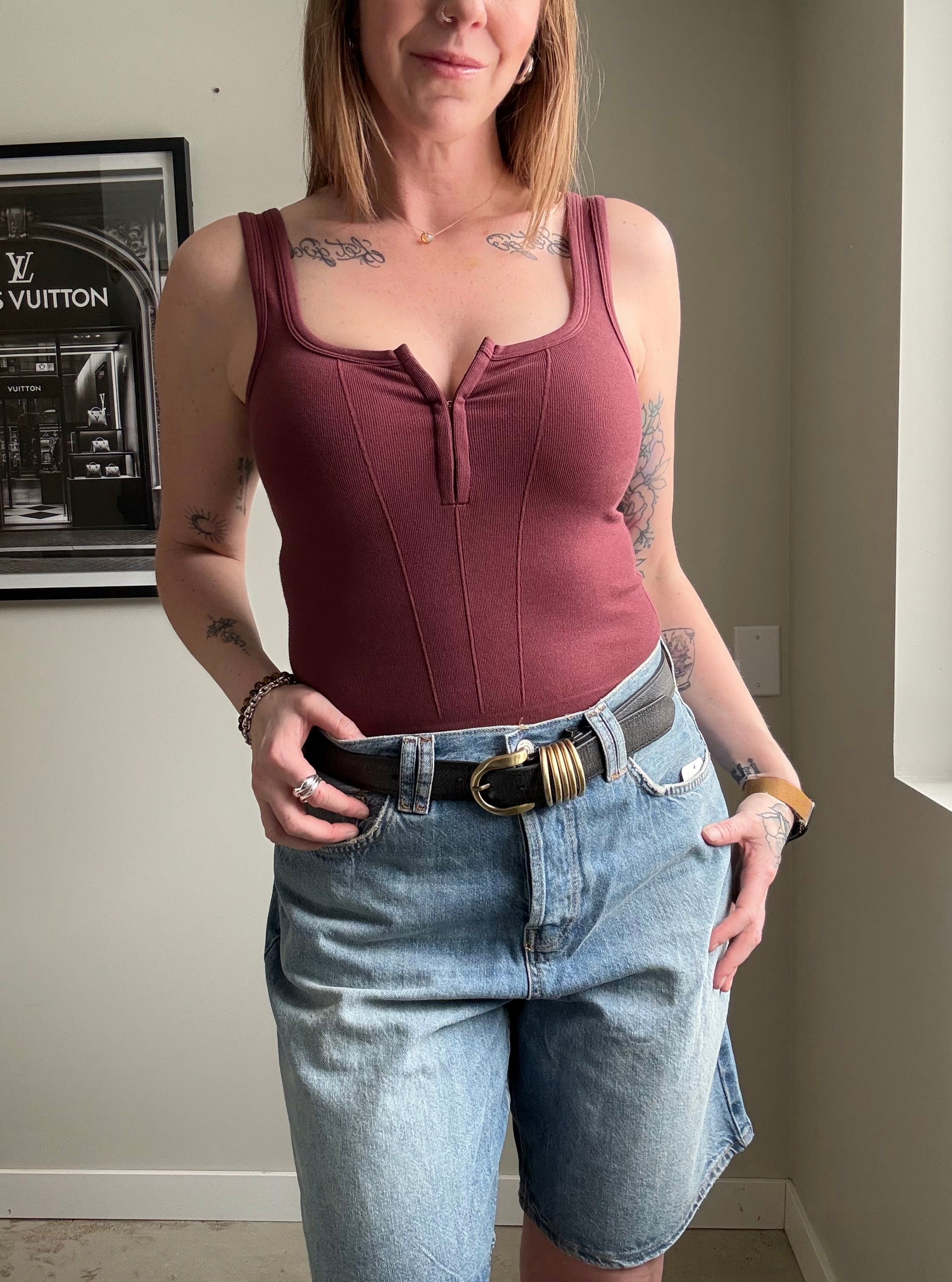Effortless ribbed square-neck cami with hook-front detail and fitted silhouette — that essential base layer that feels buttery soft and elevates every outfit with a cool, understated energy. Featuring soft, ribbed knit seamless fabrication- for a soft as ever layering cami in the most perfect shade of BrandyWine.