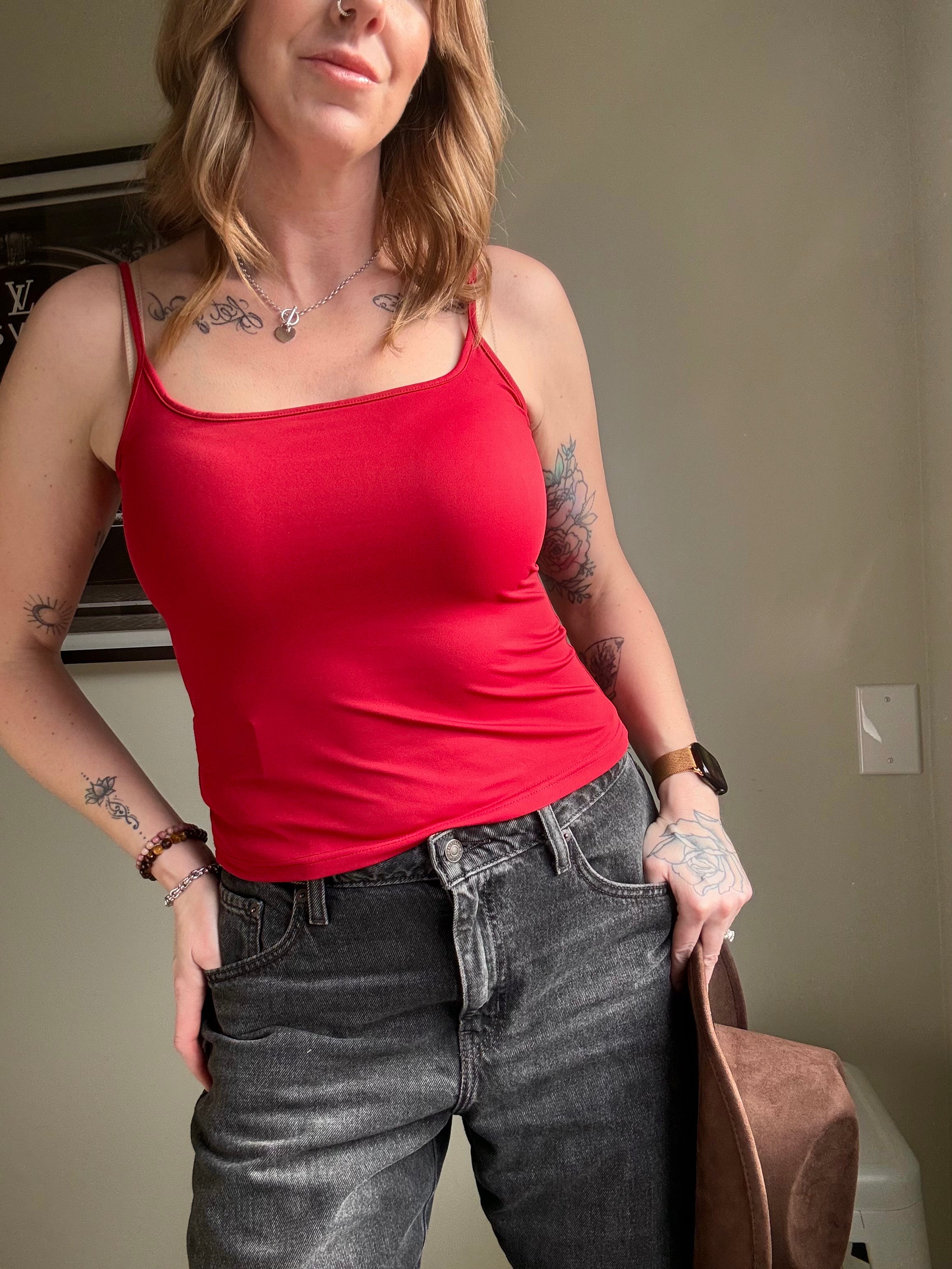 88  Basic Tank Top. The perfect basic staple for your capsule wardrobe in colours brown, black and red. Wear this cami solo or layer under a knit sweater for a cozy look or under a jean jacket for a cool girl look. This tank fits true to size for a snug fit, and wears with a good amount of stretch. The material is soft on the skin and great for everyday wear. Pair this tank with a trouser pant or denim shorts, the versatility is endless with this one. Model in photos wearing a true to size small for a comfortable and snug fit.